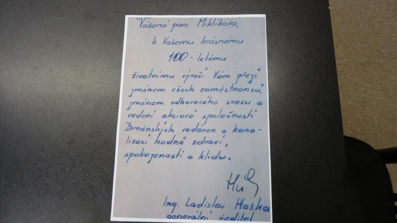 Osobně také přišel paní Miklíkové popřát mnoho zdraví do dalších let generální ředitel Brněnských vodáren a kanalizací, a.s., pan Ing. Ladislav Haška. Paní Miklíková ve vodárnách pracovala čtyřicet let.