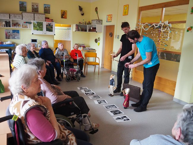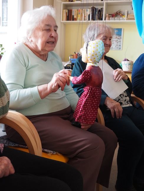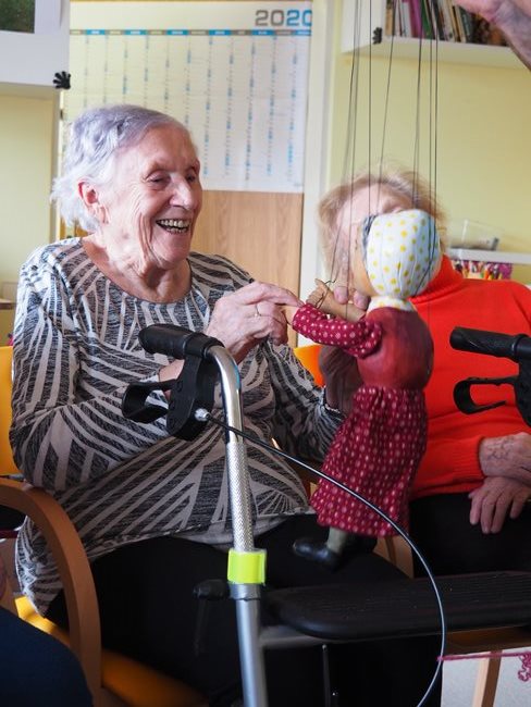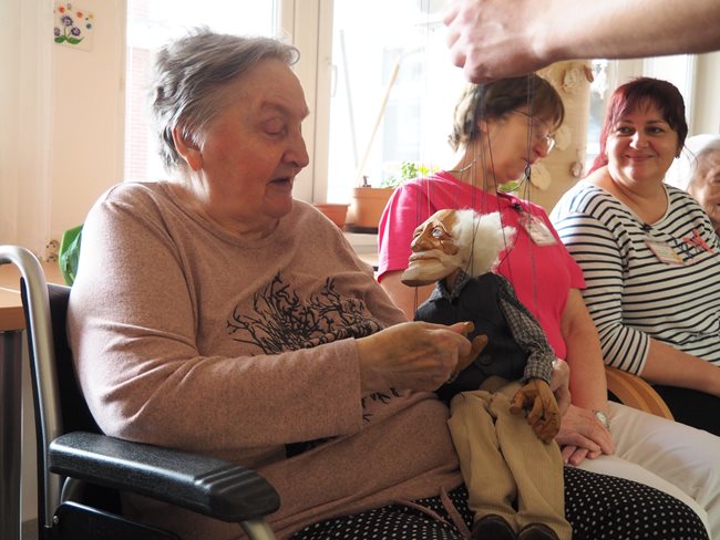 Loutkáři z Divadla bez hranic nás navštívili se svým hudebním programem. Loutky babičky a dědečka udělaly klientkám radost. Poslechly si oblíbené písničky a mohly si prohlédnout loutky posazené na klíně.