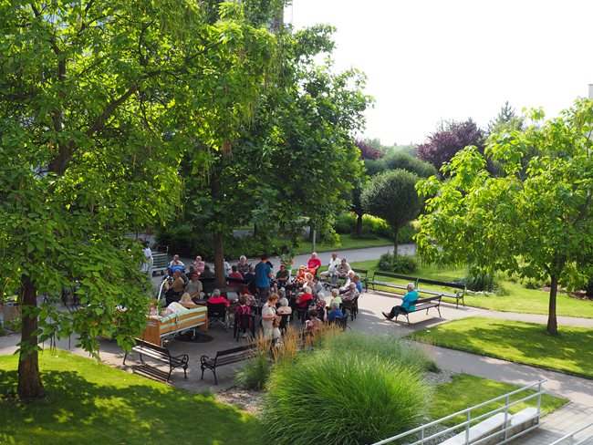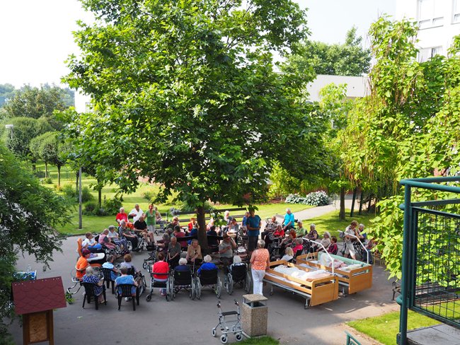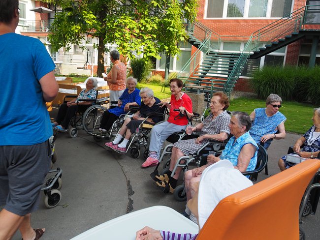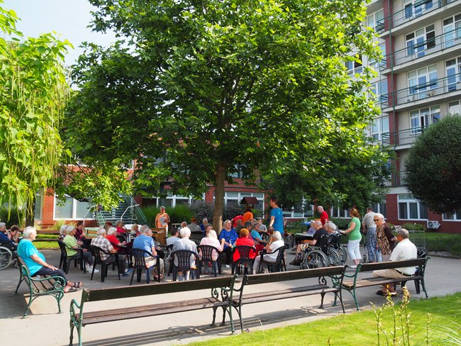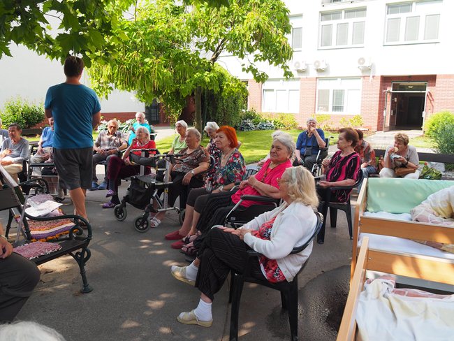 Teplá dopoledne tráví klienti s aktivizačními pracovníky ve stínu na zahradě pod platanem. Dnes si povídali o různých slovech v nářečích a jejich významu. Hádali, co znamená např. MonteBů, chálka, slopat, Prýgl atd.