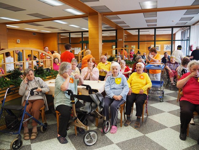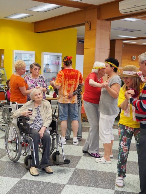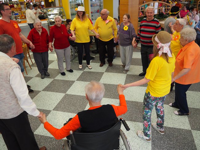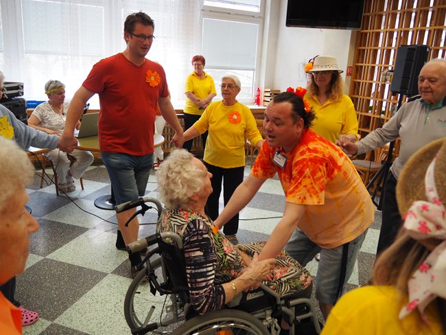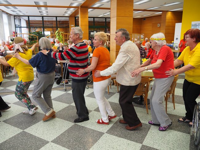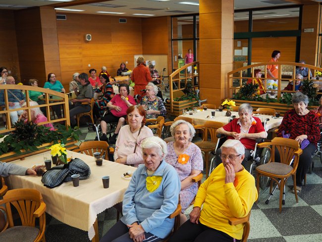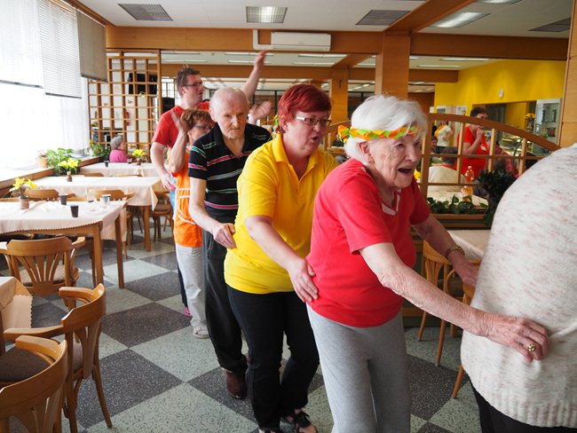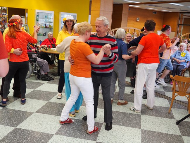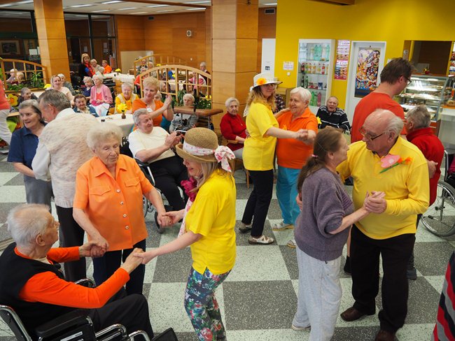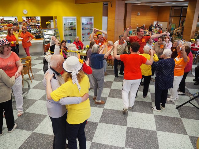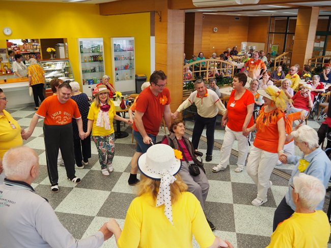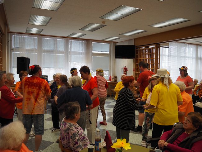 Vítání jara v oranžové a žluté s hudbou na přání a tancem. Zpívaly se a poslouchaly písničky lidové i populární.