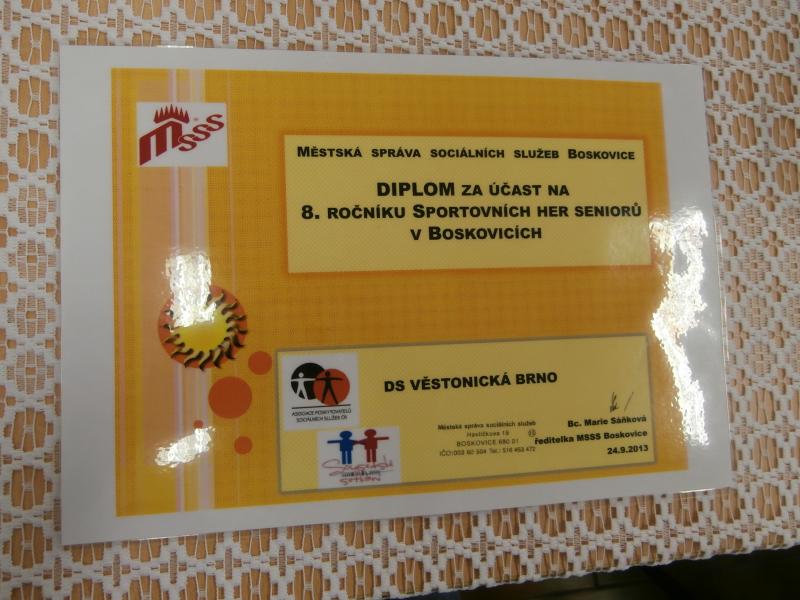 Dne 24. 9. 2013 se pět zástupců z našeho domova pro seniory zúčastnilo Květinových sportovních her v Domově pro seniory v Boskovicích. Soutěžilo se celkem v sedmi disciplínách a za naše zařízení vytvořil tým: pan Josef Janovský, pan Luboš Jelínek, paní Vlasta Zacharová, paní Marie Stehlíková a paní Anděla Horká.