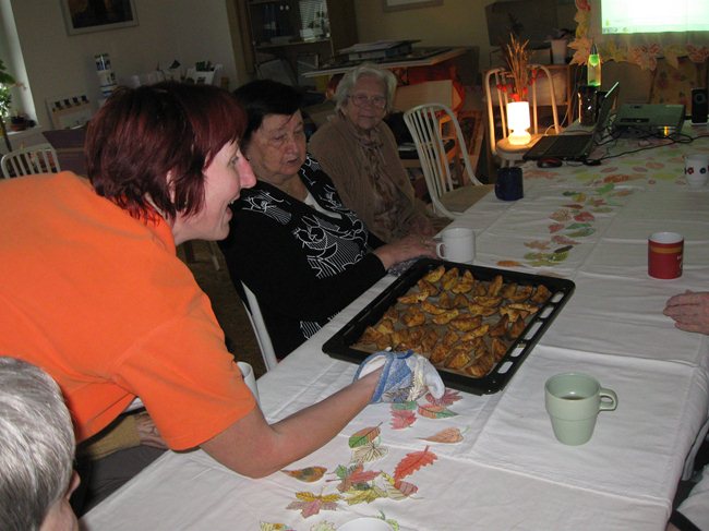 Podzimní muzikoterapie na odd. C4 a C5. Klienti si v terapeutické dílně opekli brambory, udělali podzimní výzdobu, prohlíželi obrázky s motivy podzimu a zazpívali si.