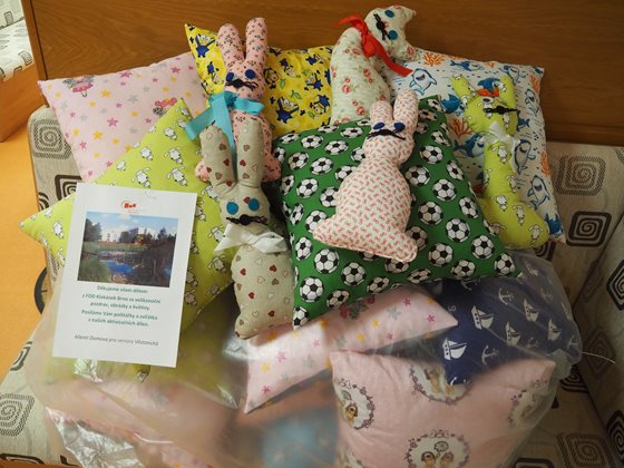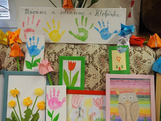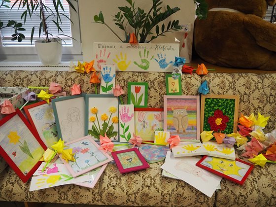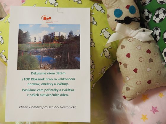 Děti z FOD Klokánek Brno věnovaly našim klientům obrázky, básničky a papírové květiny. Klienti na oplátku dětem poslali v aktivizačních dílnách vyráběné polštářky a látková zvířátka.