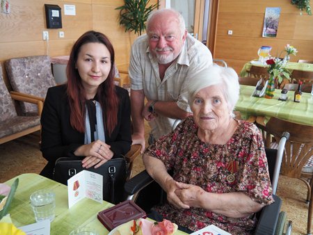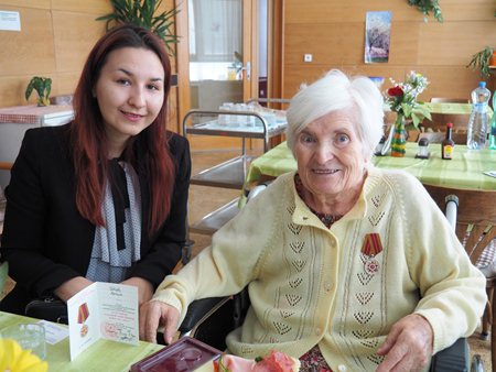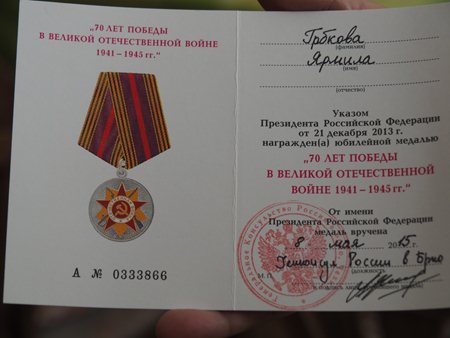 Dne 28. 7. 2015 přijala naše klientka, paní Jarmila Hrbková, při příležitosti 70. výročí vítězství ve II. světové válce z rukou atašé generálního konzulátu ruské federace v Brně paní Kariny Sultanové jubilejní medaili.