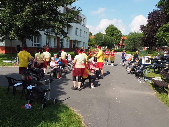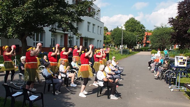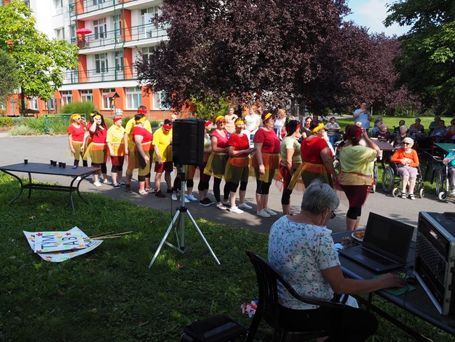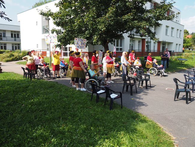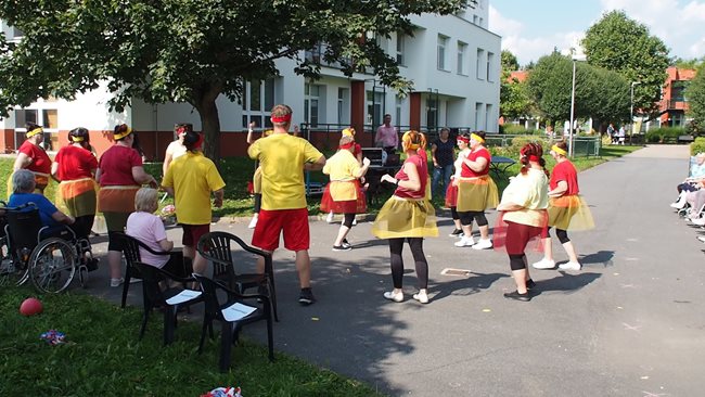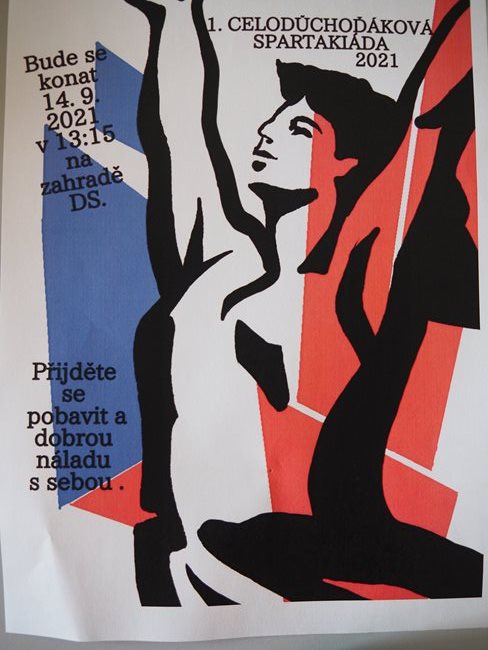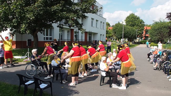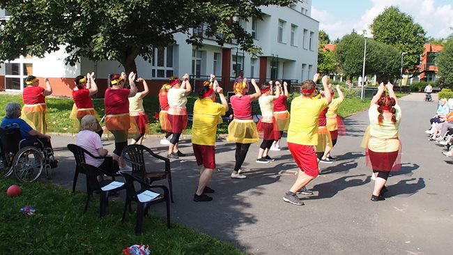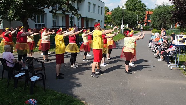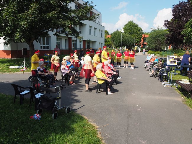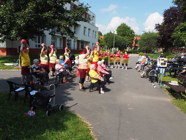 Klienti a zaměstnanci nacvičili tři skladby, které nám předvedli na I. celodůchoďákové spartakiádě. Cvičenci a cvičenky byli odměněni velkým potleskem nadšeného publika. V přestávkách, v průběhu kterých se připravovali na značkách další cvičenci, jsme se dozvěděli zajímavosti o historii spartakiád na našem území.