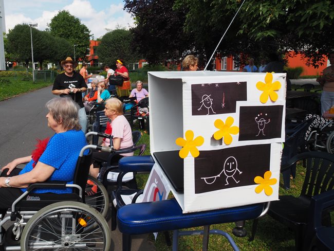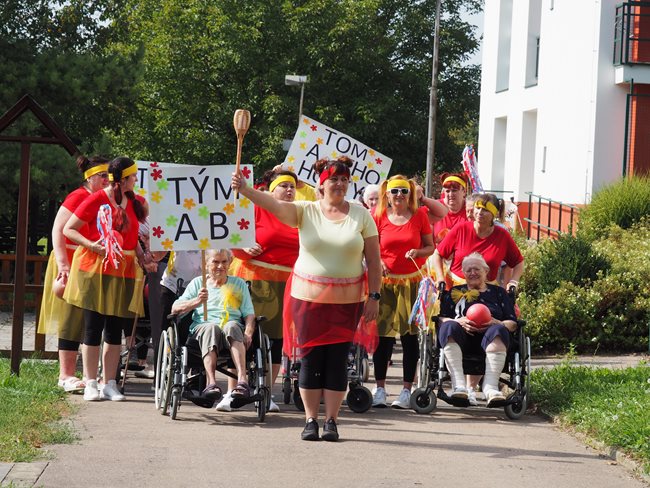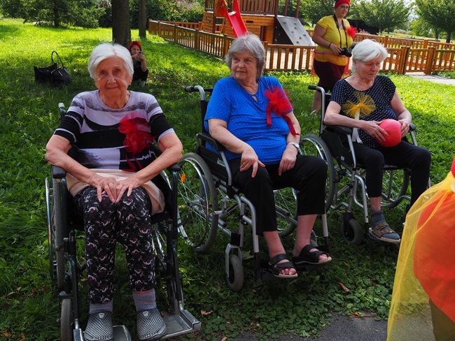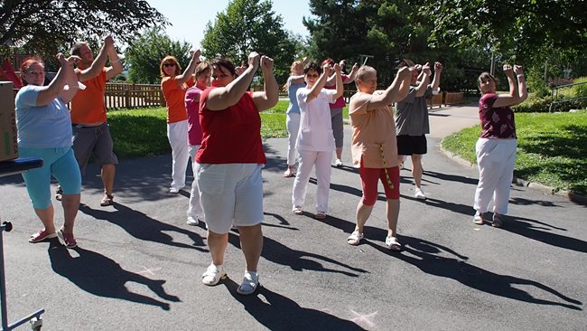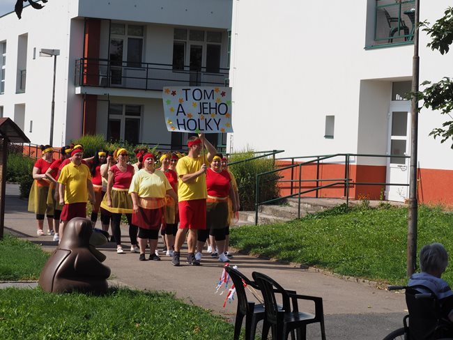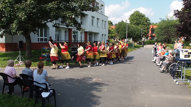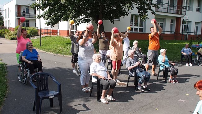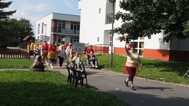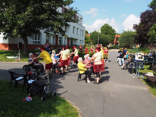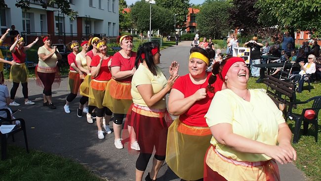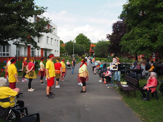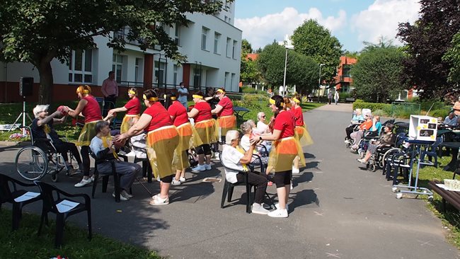 Klienti a zaměstnanci nacvičili tři skladby, které nám předvedli na I. celodůchoďákové spartakiádě. Cvičenci a cvičenky byli odměněni velkým potleskem nadšeného publika. V přestávkách, v průběhu kterých se připravovali na značkách další cvičenci, jsme se dozvěděli zajímavosti o historii spartakiád na našem území.