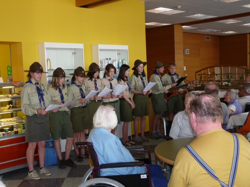 Na velikonoční svátky přišli pozdravit klienty domova skauti oddílu Brno - Tuřany. Jejich vystoupení - písničky při kytaře i scénka byly velmi milé a přátelské. Je hezké, že si v dnešní uspěchané době udělají děti a dospívající mládež čas na seniory.