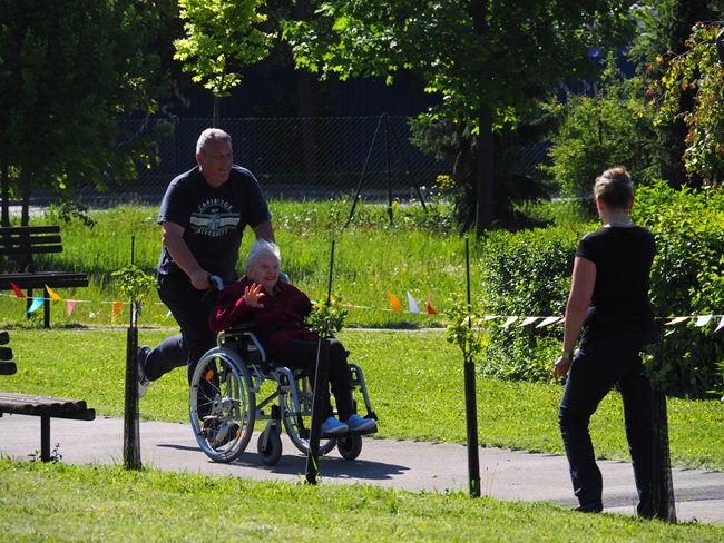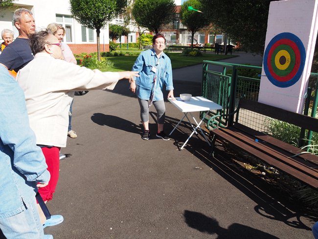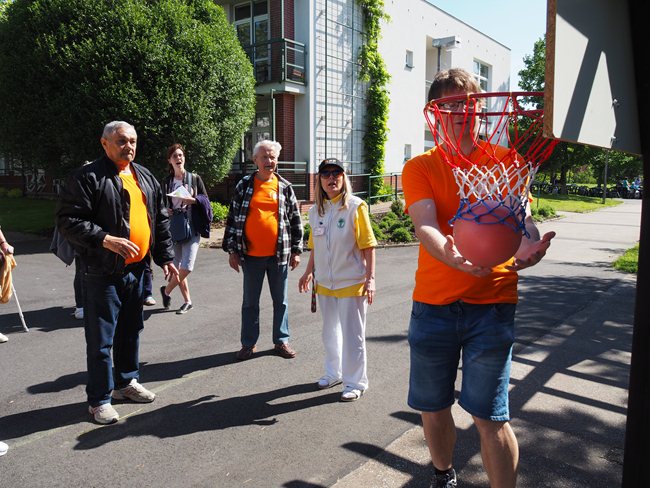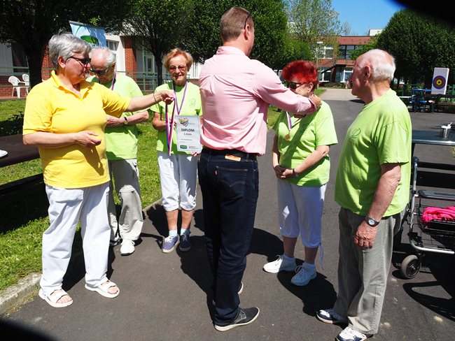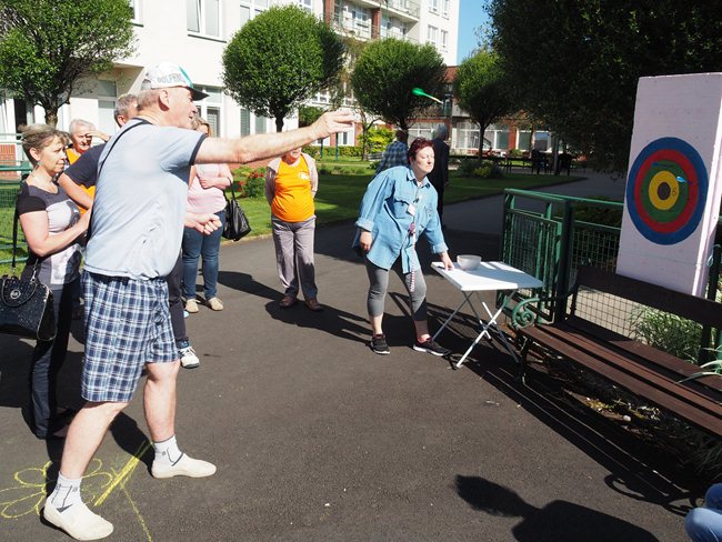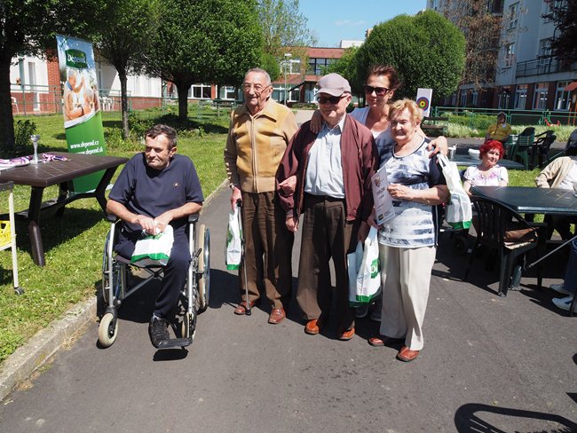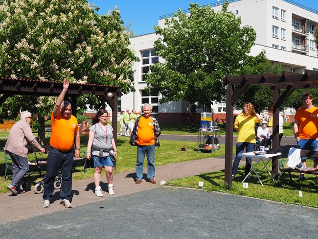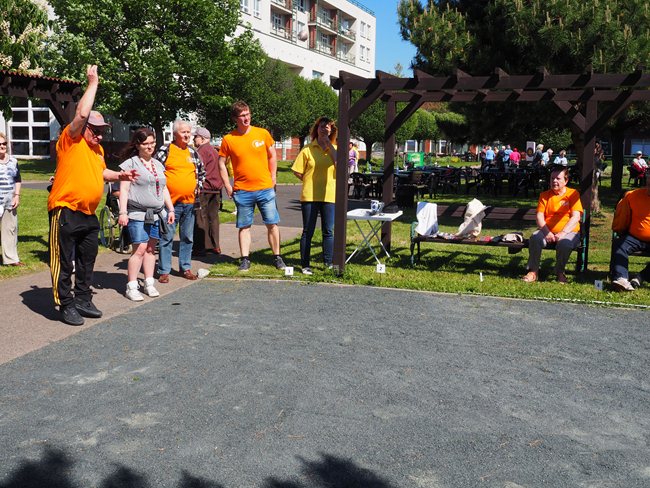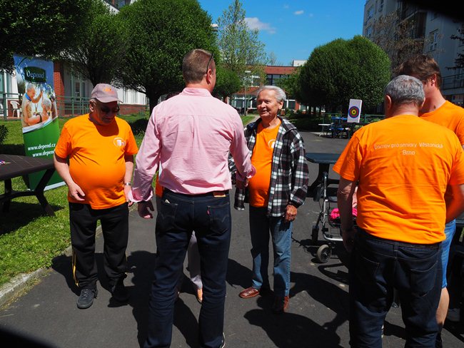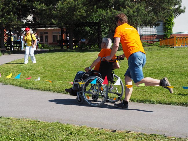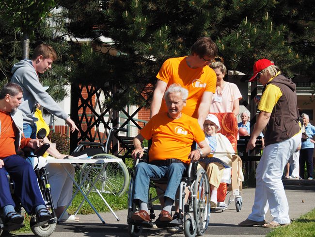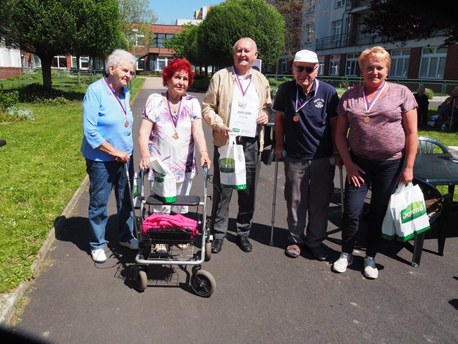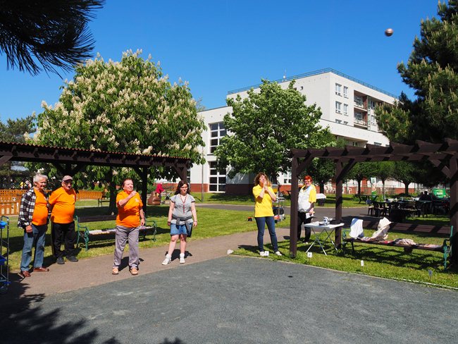 Za krásného slunečného počasí v naší zahradě proběhl již třetí ročník Věstonického pětiboje. Po slavnostním zahájení, vysvětlení pravidel a drobném občerstvení se začalo soutěžit. Deset pětičlenných týmů složených ze čtyř klientů a jednoho zaměstnance z domovů pro seniory v Brně soutěžilo v pěti disciplínách: košíkové, šipkách, maratonu (běžel zaměstnanec a na vozíku vezl klienta), vrhu koulí a cyklistice.