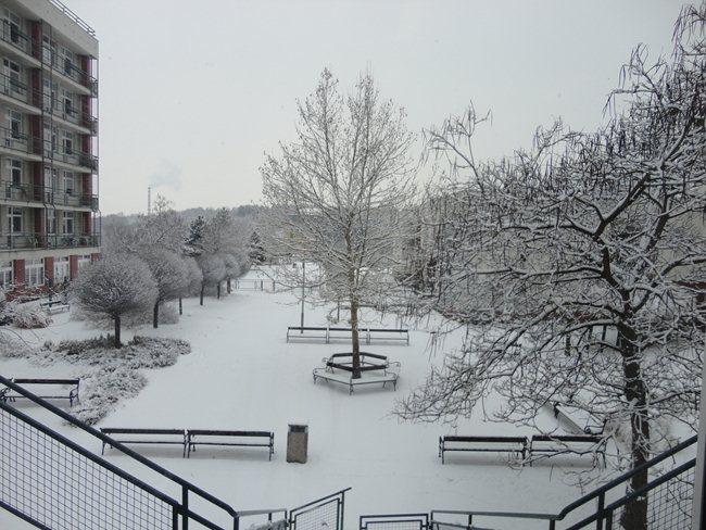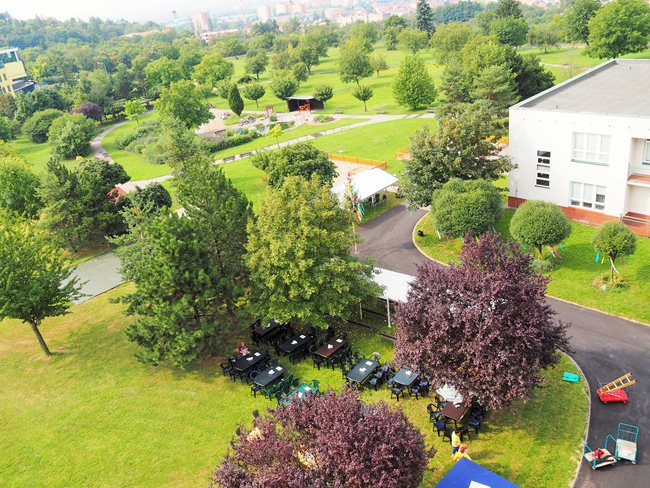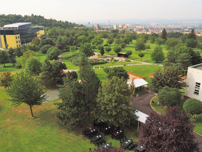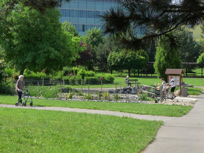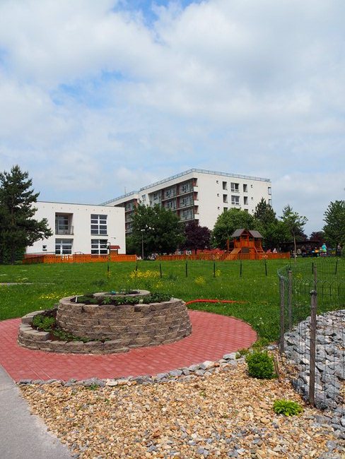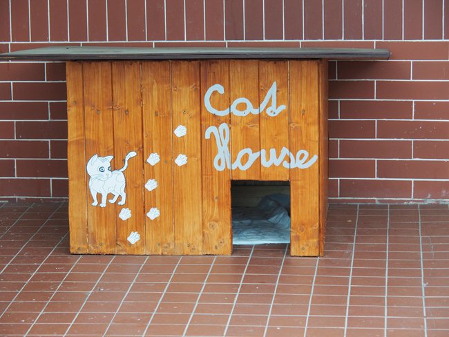 Součástí átria u budovy B1 jsou domečky pro kočky a kocoury - obyvate zahrady a blízkého okolí.