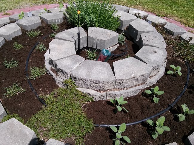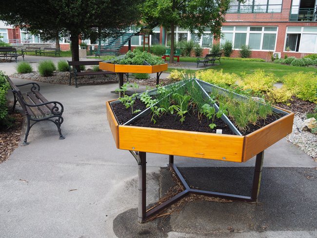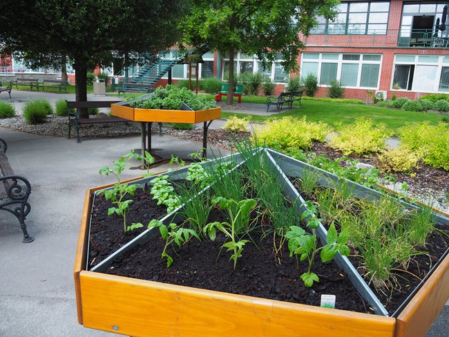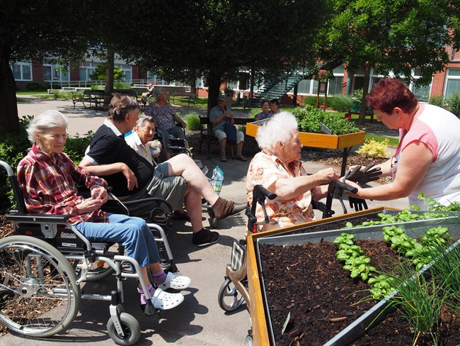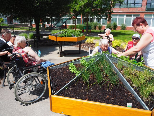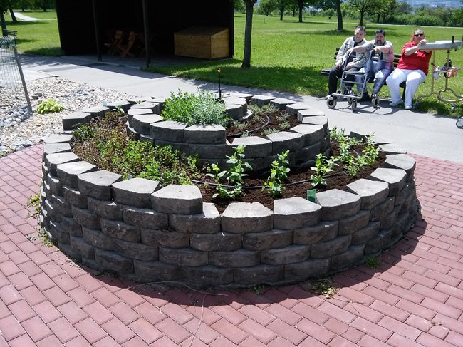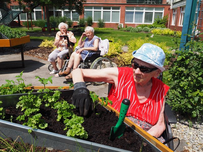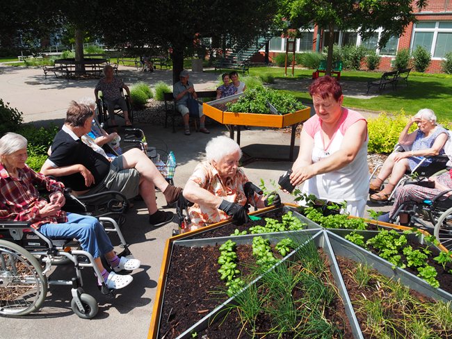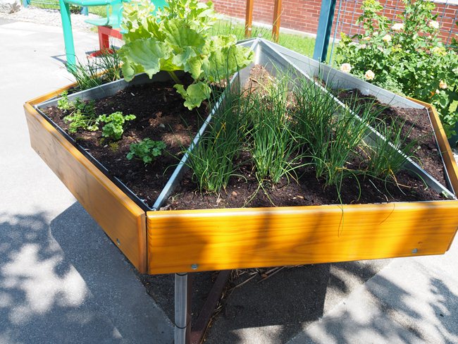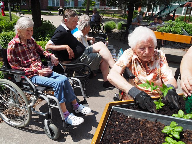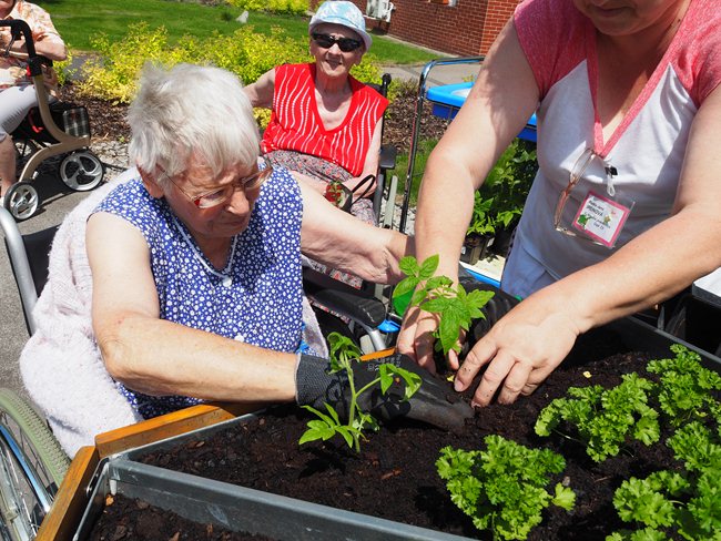 Sazenice rajčat, které měli klienti doma, aby o ně pečovali, byly za pěkného slunečného odpoledne zasazeny do velkých vyvýšených truhlíků. V truhlících již je rebarbora a bylinky - např. bazalka, máta, petržel.