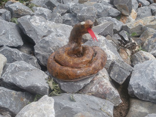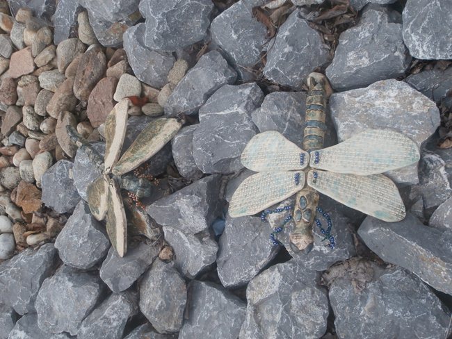 K zahradnímu jezírku byly nainstalovány výrobky klientů z hlíny - vážky a hadi.