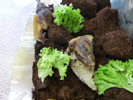 suchozemských hlemýžďů. Jeho ulita může dosáhnout až 20 cm a může vážit až 500 g. Šneci doslova rostou před očima, chutná jim všechno - hlavně zelenina, ovoce, chleba, ale i sépiová kost.