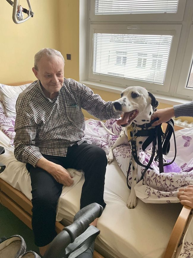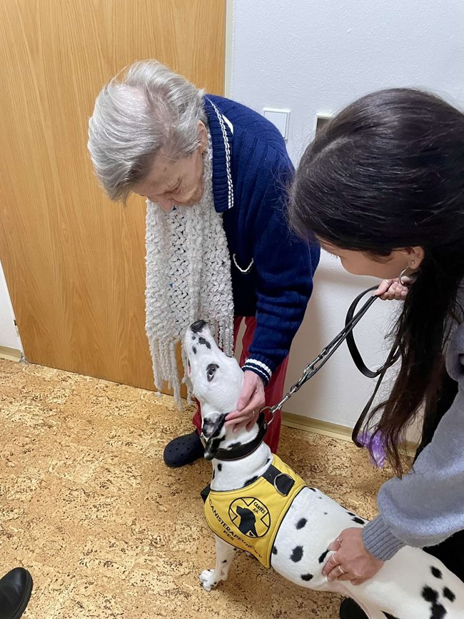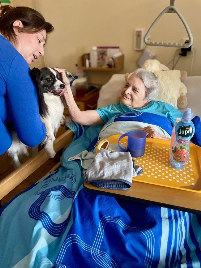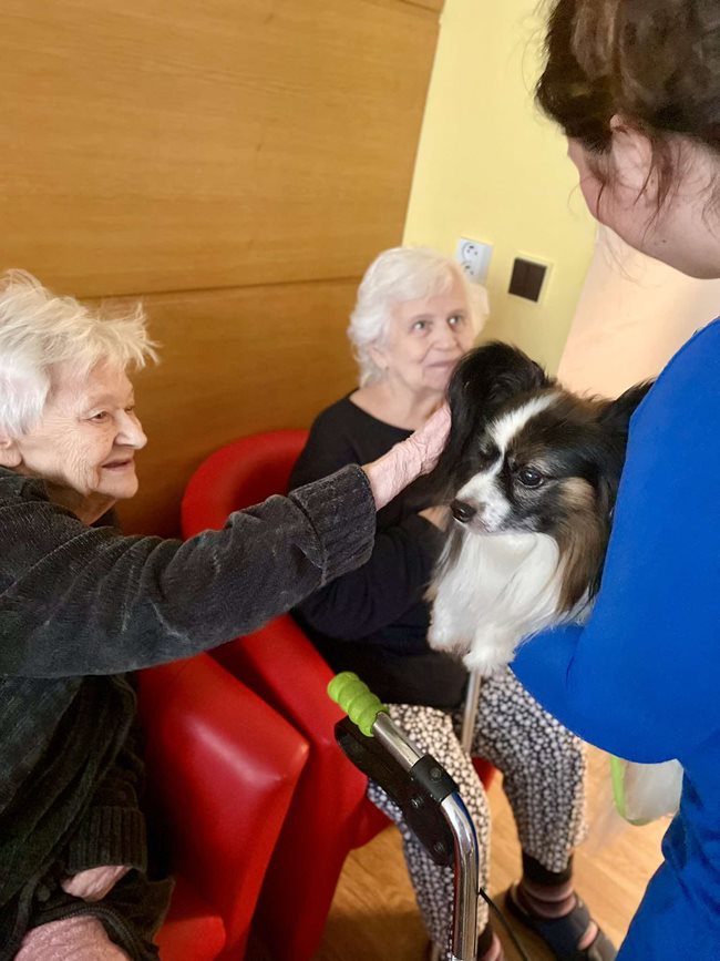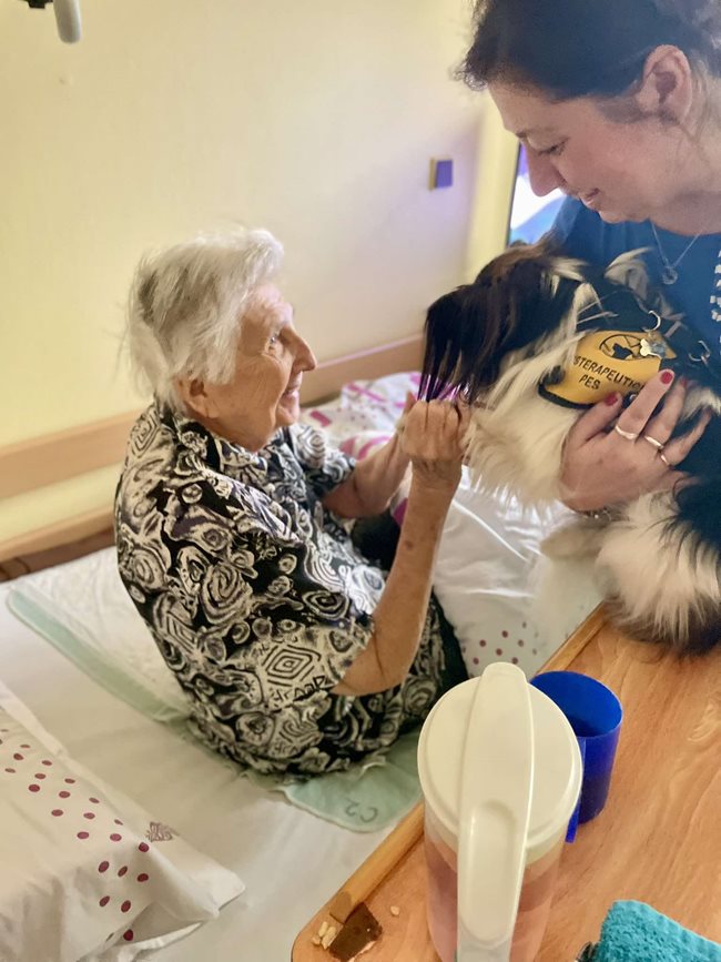 canisterapie – terapeutické setkání s vycvičenými psy, které přináší našim klientům radost, uvolnění a mnoho dalších přínosů. Dotek psí srsti, pohled do laskavých očí a přátelská přítomnost čtyřnohých terapeutů pomáhají snižovat stres, podporují jemnou motoriku, stimulují komunikaci a přinášejí vzpomínky na dřívější chvíle se zvířaty. Tato terapie je zvláště prospěšná pro klienty s demencí či Alzheimerovou chorobou, kterým pomáhá navázat kontakt s okolním světem a prožívat radostné okamžiky. Canisterapie probíhá jak individuálně u lůžka, tak ve skupinách, kde si klienti mohou pejsky pohladit, nakrmit nebo si s nimi hrát. Pravidelně k nám docházejí zkušení canisterapeuti se svými psy, kteří jsou speciálně vyškoleni pro práci se seniory. Těšíme se na další setkání, která přinášejí našim klientům úsměv na tvář a zahřejí je u srdce.