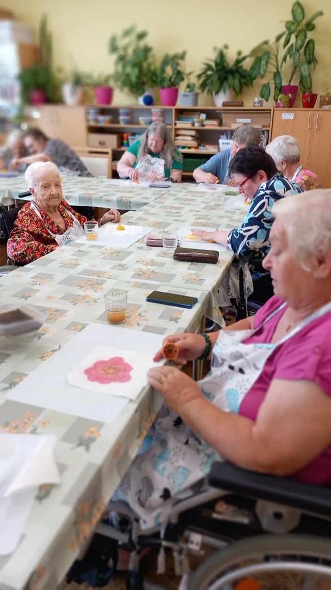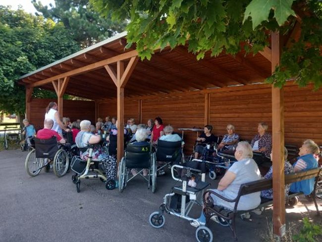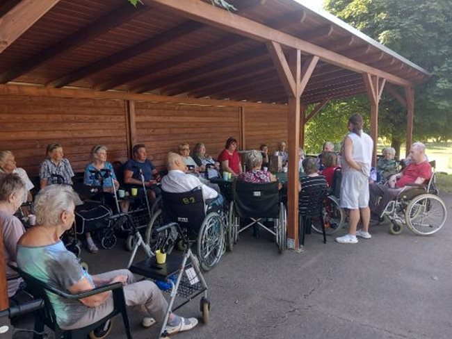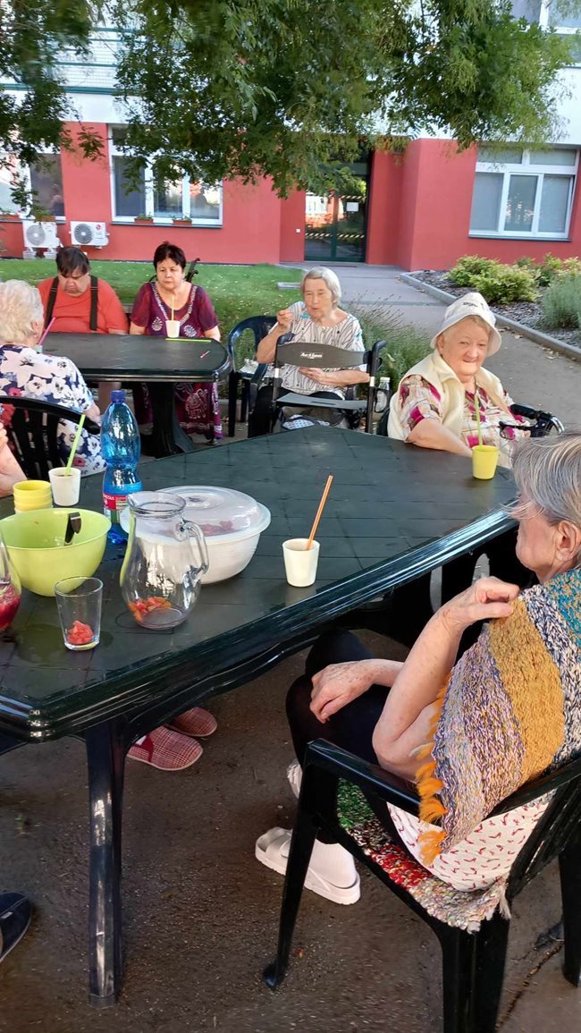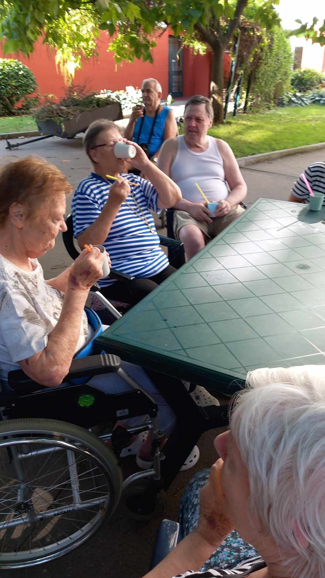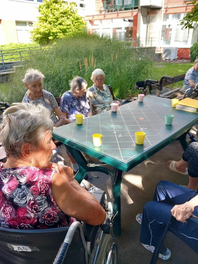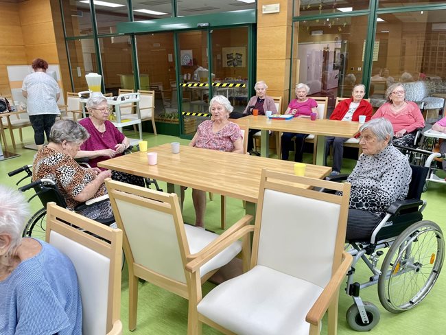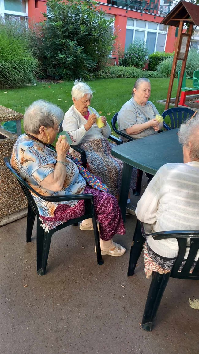 Hezké letní počasí využíváme k odpočívání a aktivizaci v zahradě, kde také pečujeme o rajčata, sklízíme levanduli a pochutnáváme si na melounu. Na odděleních v budově C se opravují podlahy, proto využíváme k aktivizaci také velkou jídelnu.