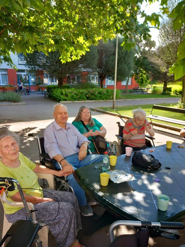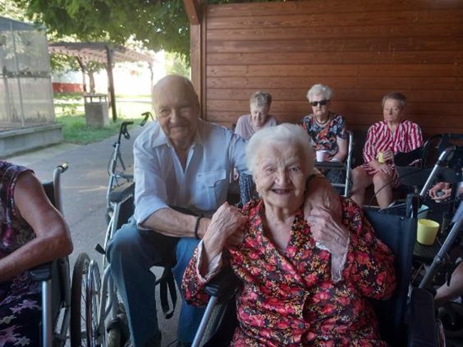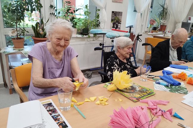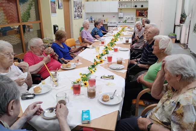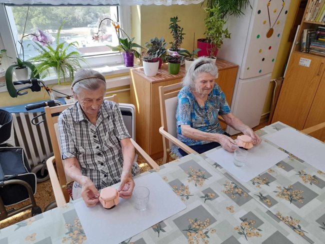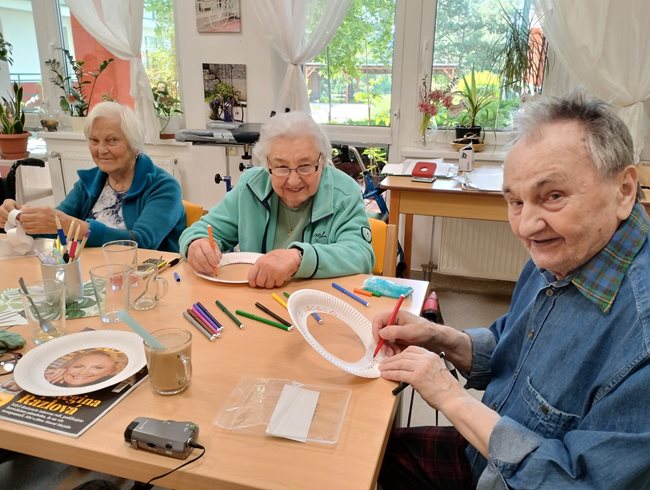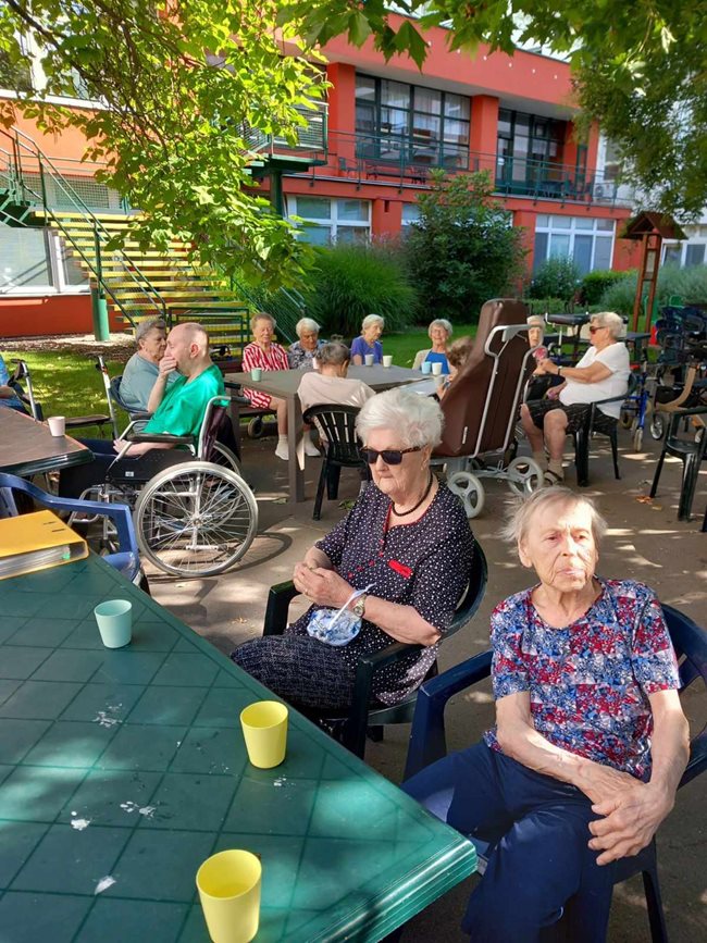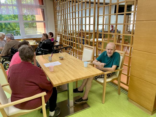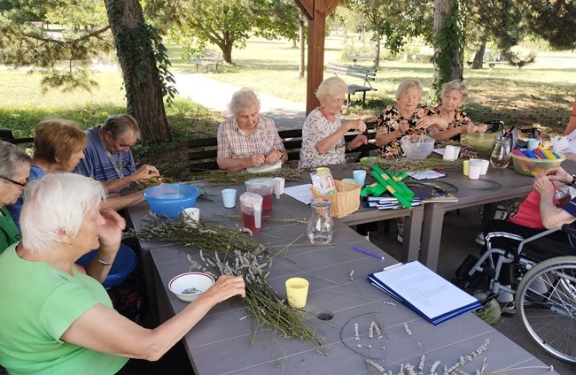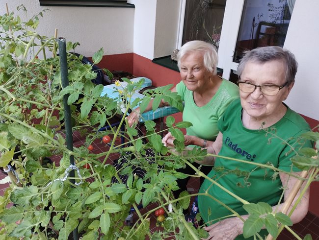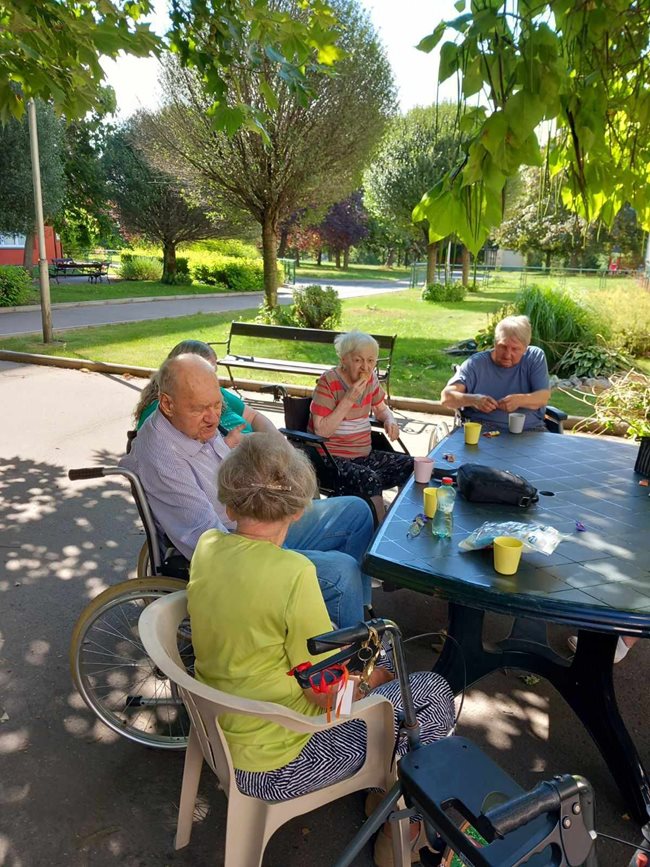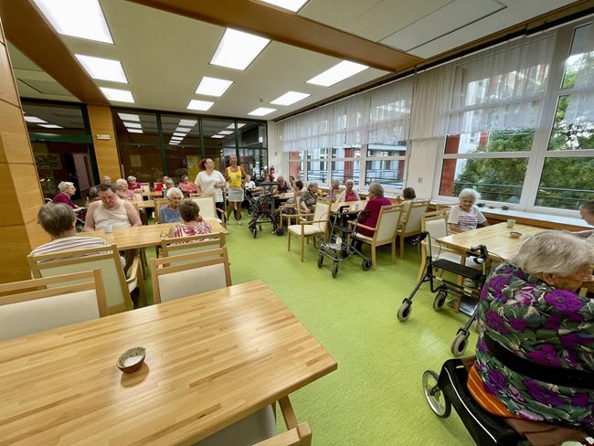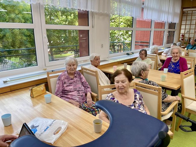 Hezké letní počasí využíváme k odpočívání a aktivizaci v zahradě, kde také pečujeme o rajčata, sklízíme levanduli a pochutnáváme si na melounu. Na odděleních v budově C se opravují podlahy, proto využíváme k aktivizaci také velkou jídelnu.