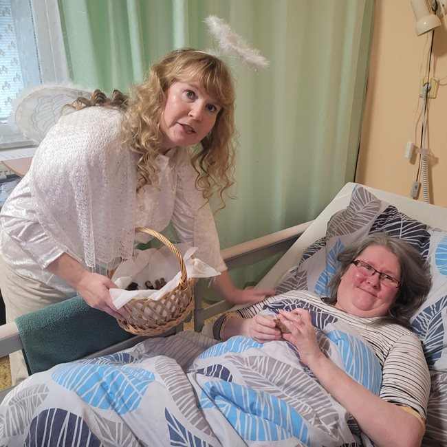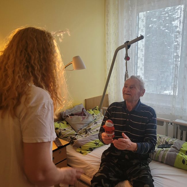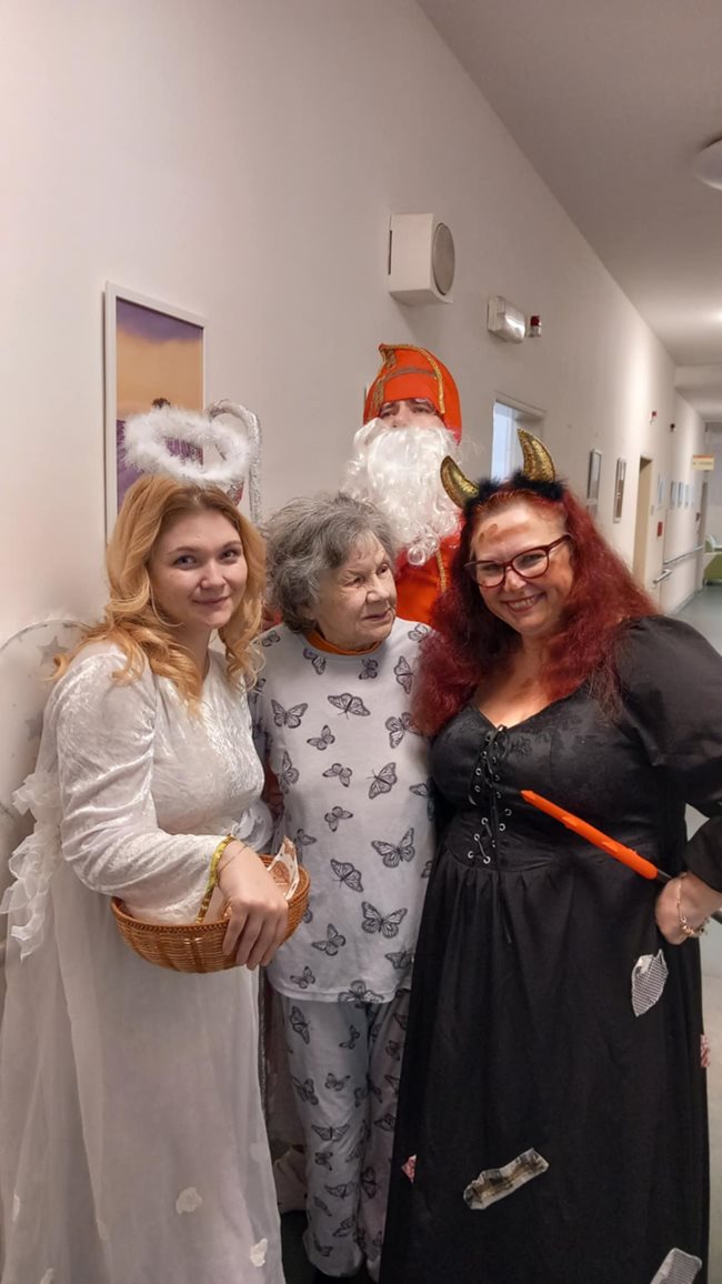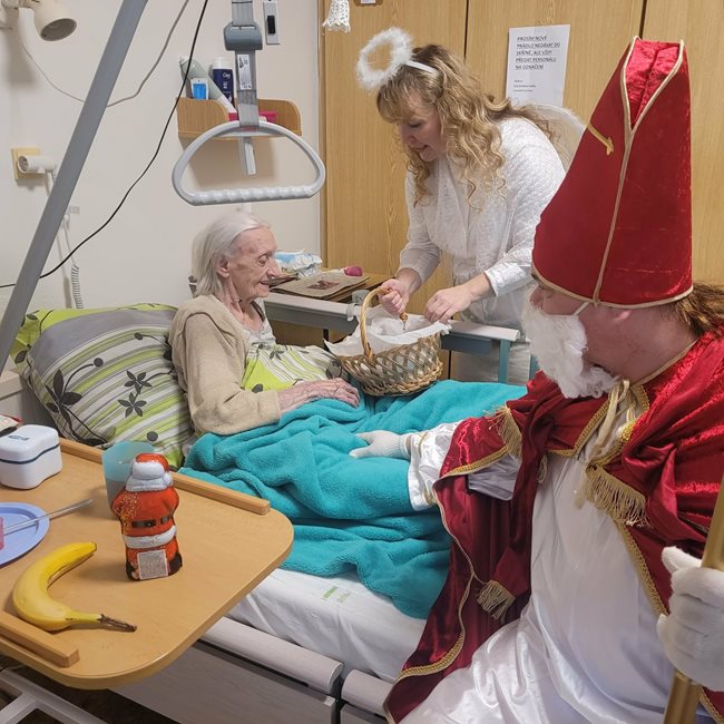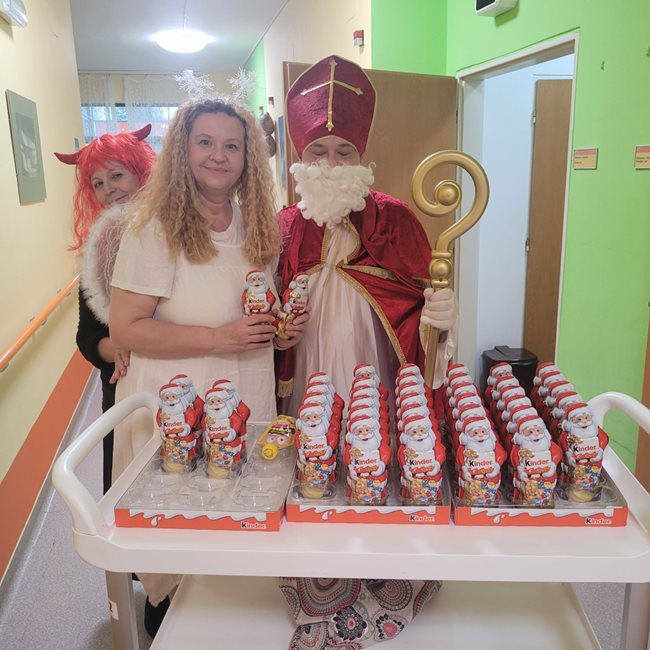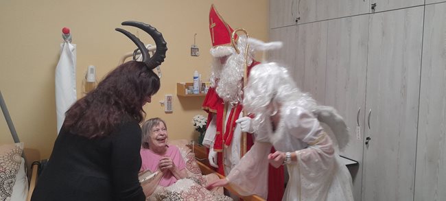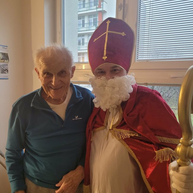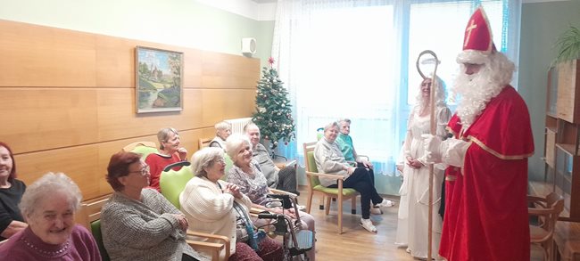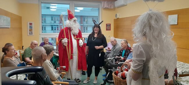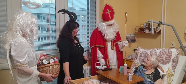 V pátek nás v domově navštívily hned dvě mikulášské skupinky, které potěšily naše klienty nejen na společných odděleních, ale také přímo na jejich pokojích. Mikuláš s anděly a čerty, v podání našich aktivizačních pracovníků, rozdávali úsměvy, dobrou náladu i malou nadílku. Klienti si zavzpomínali na tradiční zvyky a návštěva pro ně byla příjemným zpestřením adventního období.