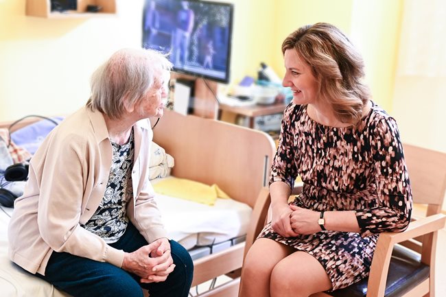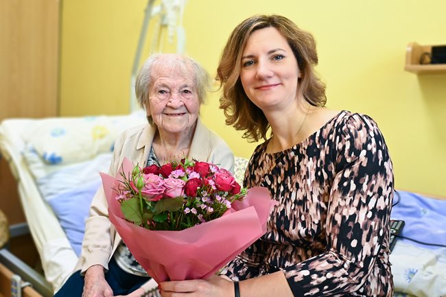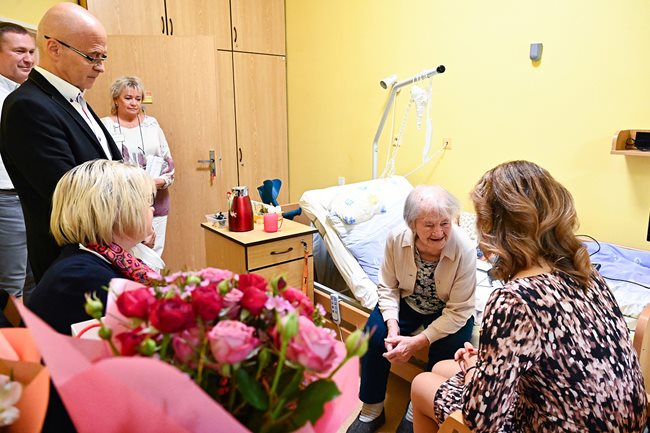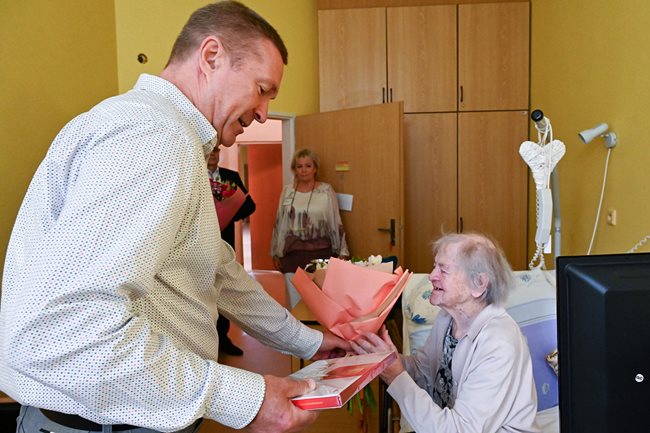 Paní Marii Schmidové ke krásnému životnímu jubileu přišla osobně popřát paní primátorka města Brna paní JUDr. Markéta Vaňková, vedoucí odboru sociální péče Magistrátu města Brna pan PaedDr. Jan Polák a ředitel našeho domova pro seniory pan Ing. Rudolf Nytl.