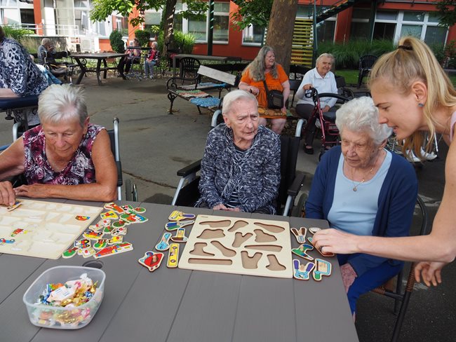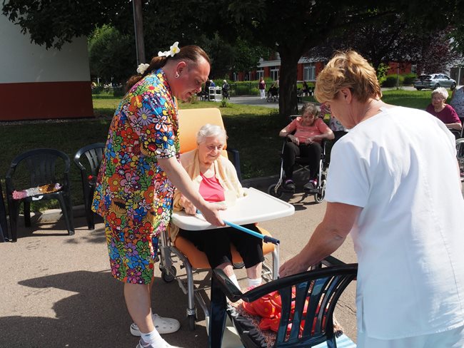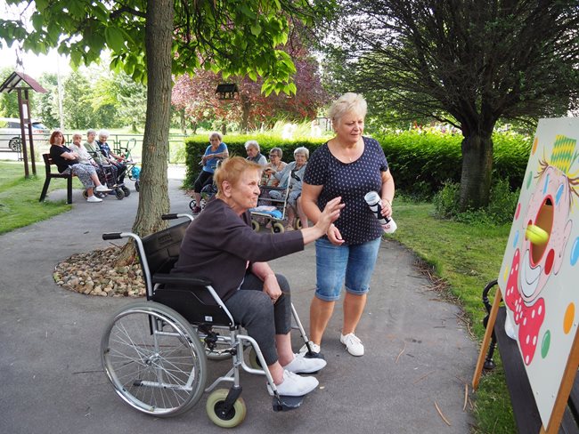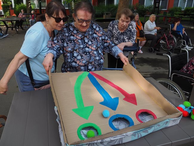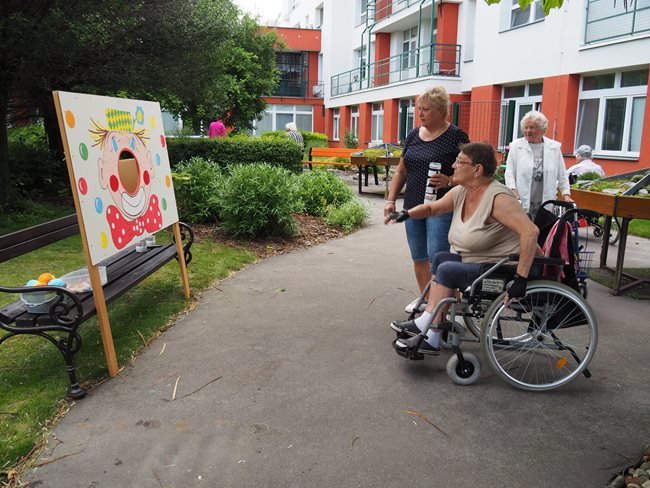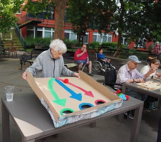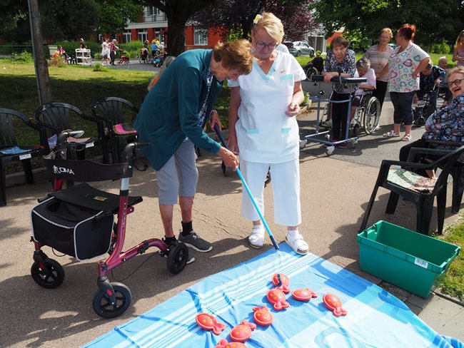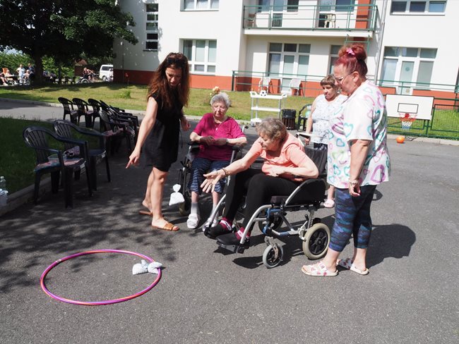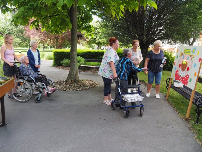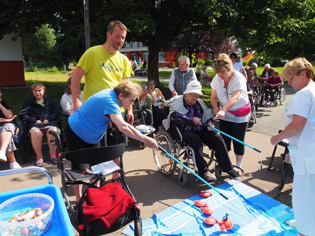 Tradicí letních dní v našem domově pro seniory jsou sportovní hry pro naše klienty, které pořádají sociální pracovnice a vrchní sestra. I letos jsme se sešli v zahradě v chládku pod stromy u jednotlivých disciplín za jejichž splnění dostali klienti sladkou odměnu. Příjemné bylo posedět v chládku pod stromy nebo se zahřát na sluníčku u hry na rybáře. Procvičili jsme paměť a představivost u puzzlí, trefovali se do basketbalového koše míčem, do kruhu pytlíky a tenisáky do pusy šaška. Sportovci se mohli osvěžit limonádou. Když bylo potřeba, pomohly klientům s doprovodem pracovnice aktivizace a rehabilitace.