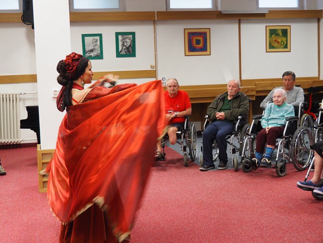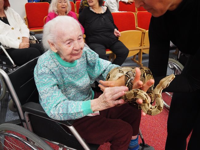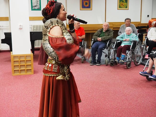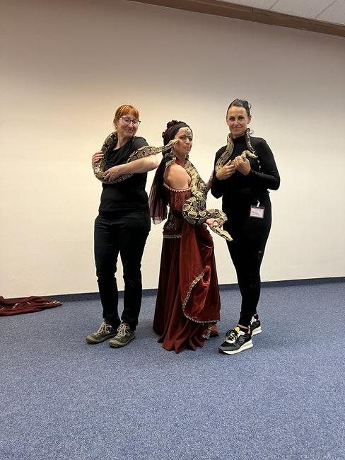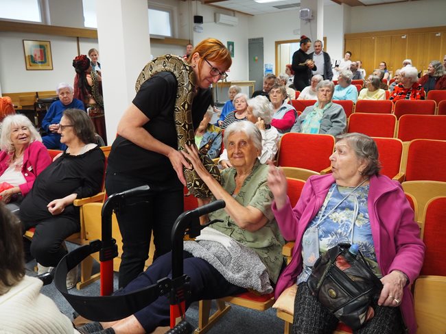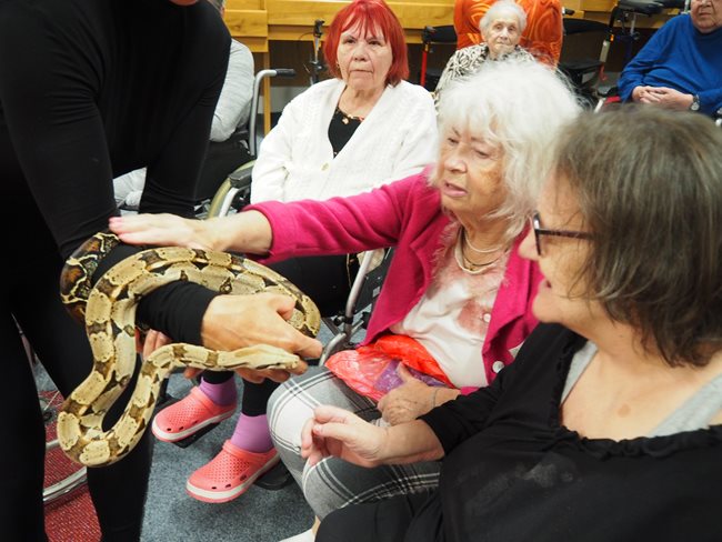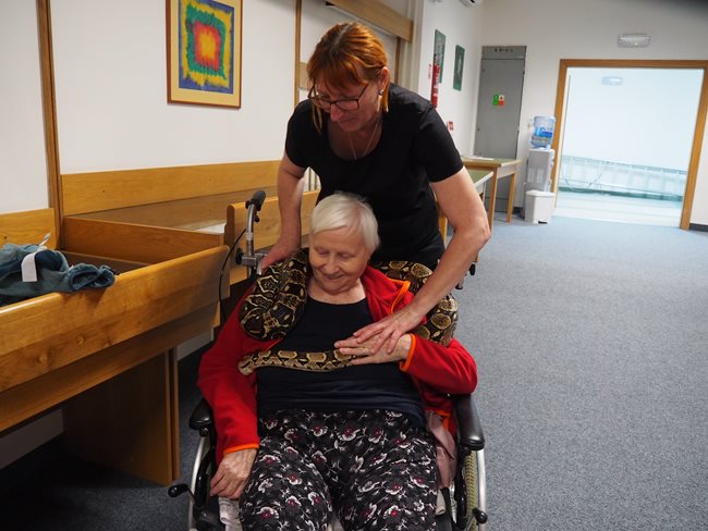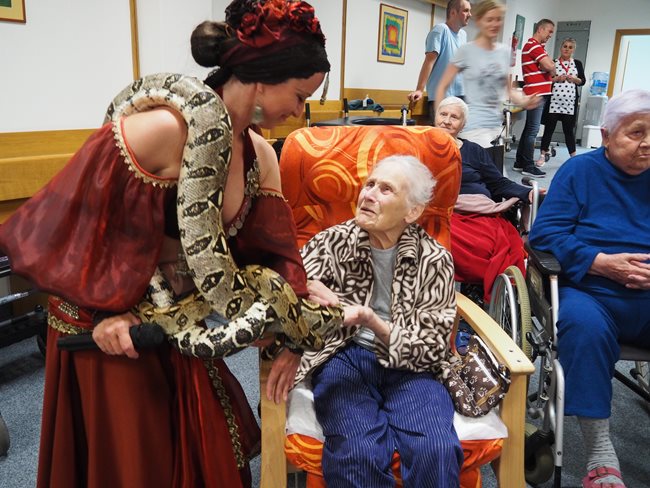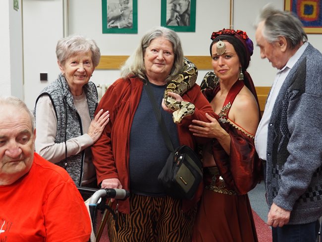 V našem domově pro seniory jsme přivítali velmi exotickou návštěvu. Přijela nám zatancovat tanečnice s hady, a tak jsme měli možnost prohlédnout si a obdivovat tři hroznýše královské – osmnáctiletou matku tohoto druhu škrtiče a její dvě hadí děti. Klienti měli také možnost se s hady vyfotografovat a dozvědět se o jejich životě ve volné přírodě, stravě a o chovu těchto plazů v zajetí.