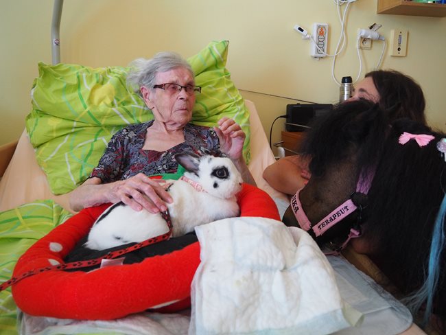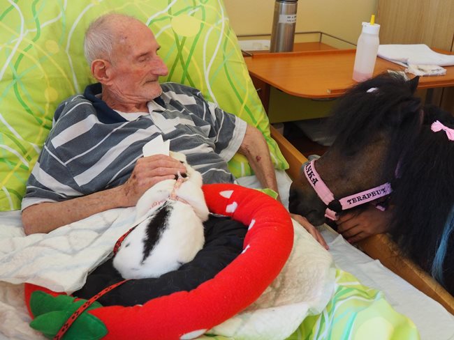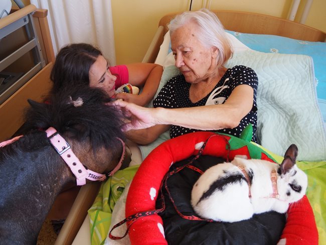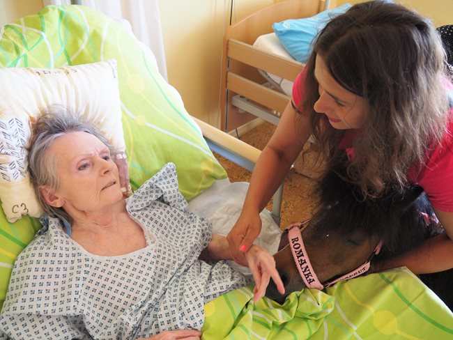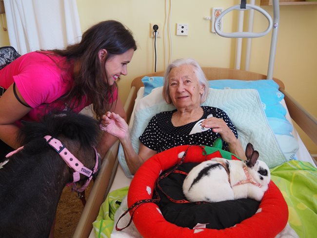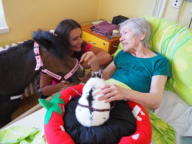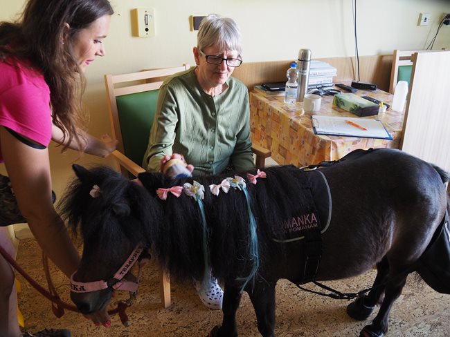 Dnes nás navštívila klisnička Romanka a králíček Jasmínka. Romance je 16 let, pochází z Texasu a je to terapeutický koník plemene Falabella.