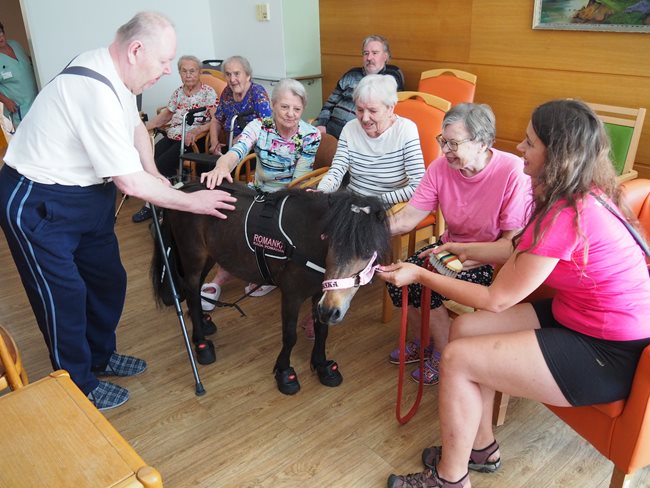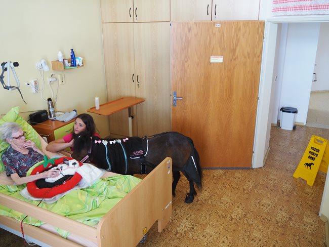 Od nadačního fondu Českého rozhlasu a jejich sbírky Ježíškova vnoučata jsme obdrželi dárkový poukaz na návštěvu terapeutického koníka Emila a jeho zvířecích přátel s jejich majitelkou paní Veronikou. Dnes tedy proběhla již druhá návštěva koníka a byla zaměřená na individuální návštěvu u klientů, kteří jsou upoutaní na lůžko.