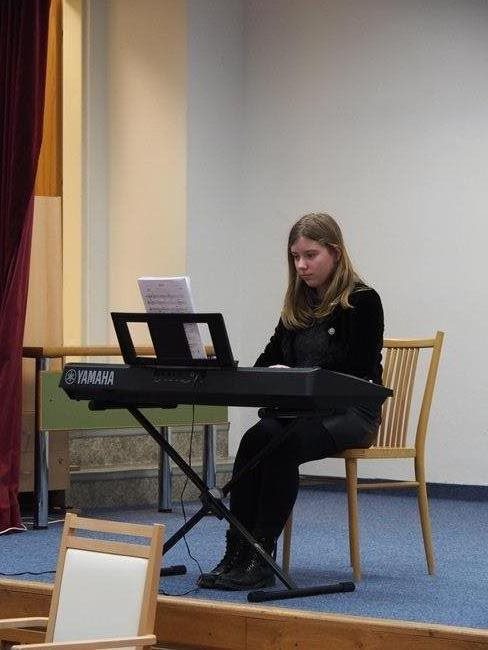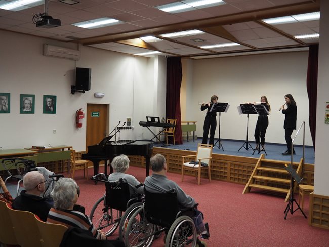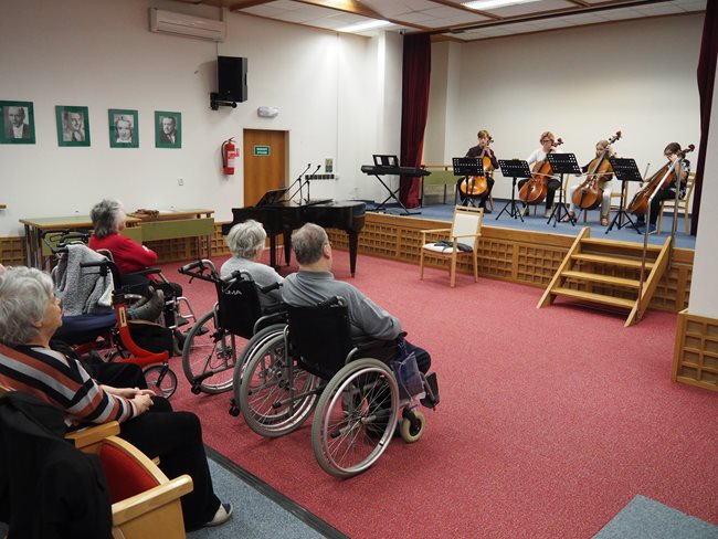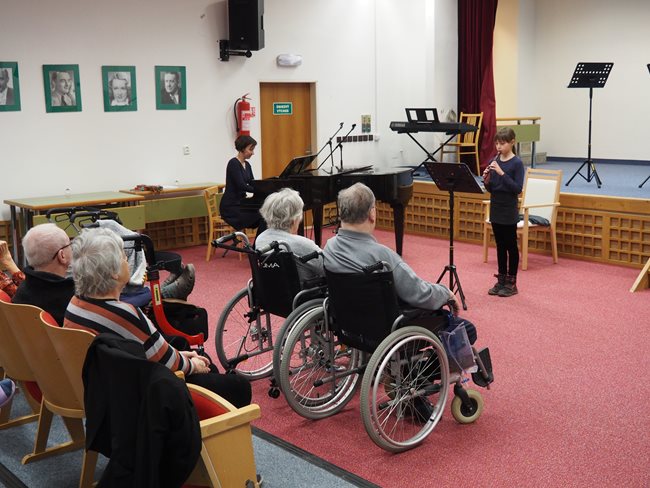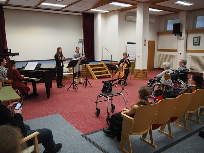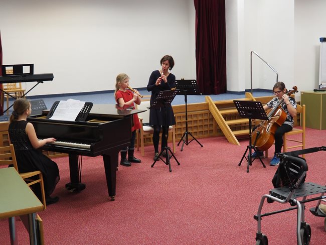 Děti ze ZUŠ PhDr. Zbyňka Mrkose se připravují na soutěž mezi základními uměleckými školami. Vyslechli jsme si skladby pro keyboard, trio příčných fléten, pro kvartet různých hudebních nástrojů, pro violoncellový kvartet a sólovou flétnu. S těmito skladbami budou děti soutěžit. Popřáli jsme jim hodně štěstí a doufáme, že nám opět přijdou zahrát.
