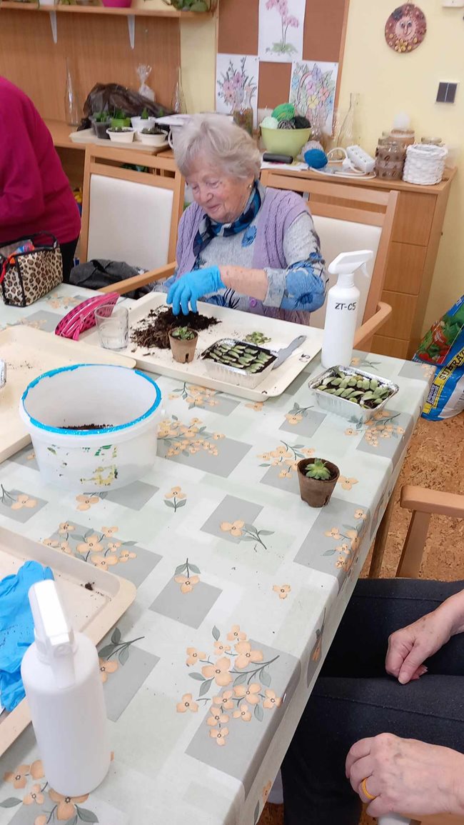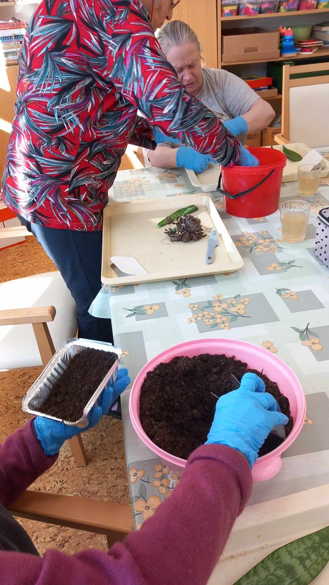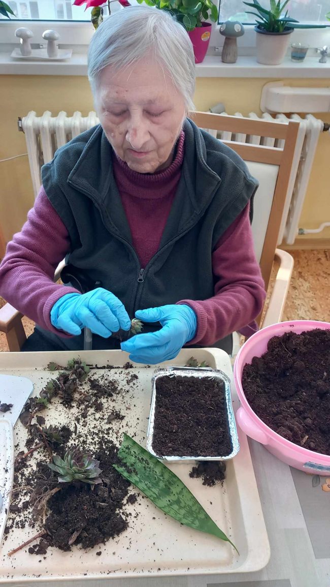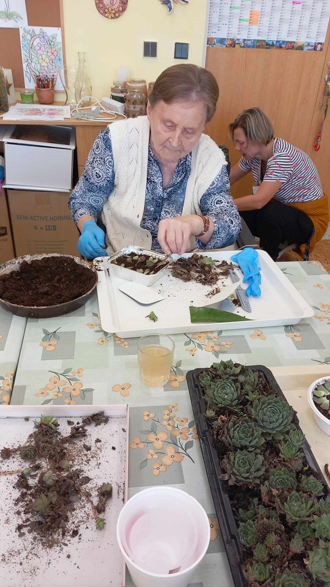 V zahradní terapii jsme si připravovali materiál na dlouhodobější projekt, který máme v plánu. Klienti si vytvoří svou malou zahrádku z rozchodníků, a proto bylo potřeba připravit spoustu nových sazenic. Nyní budeme čekat, a o řízky pečovat a až řízky zakoření a povyrostou, budeme moci minizahrádky osázet.
