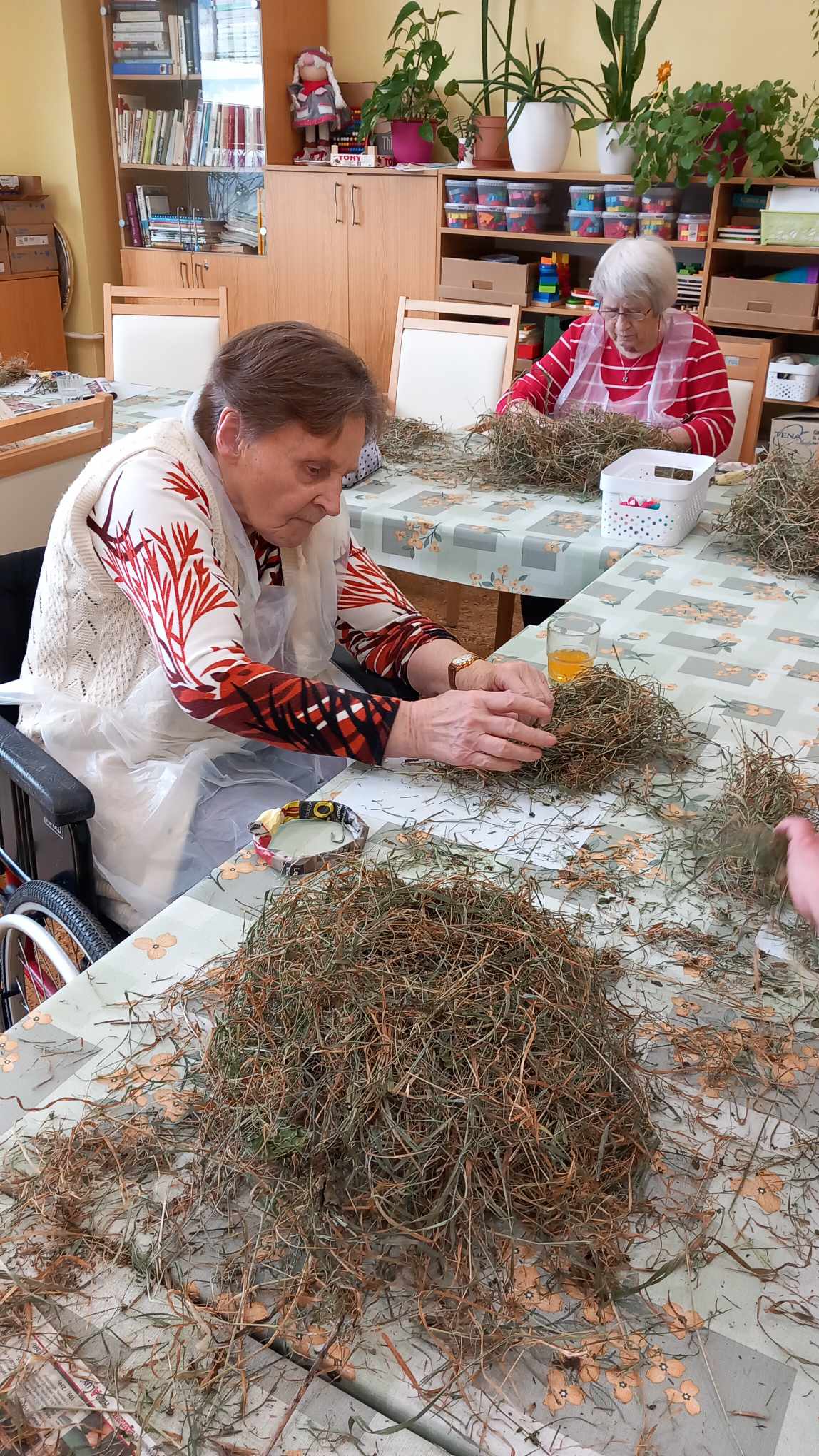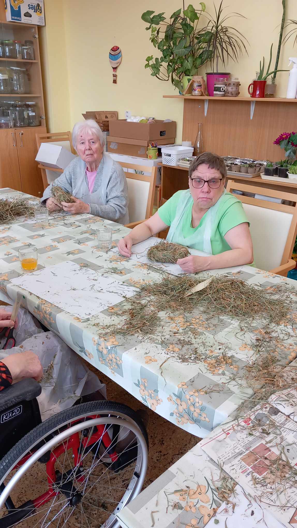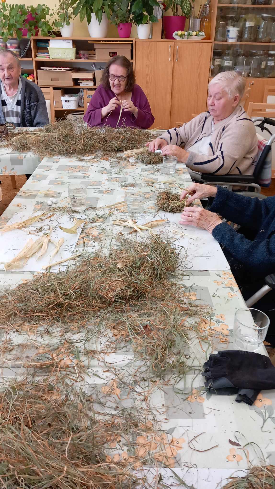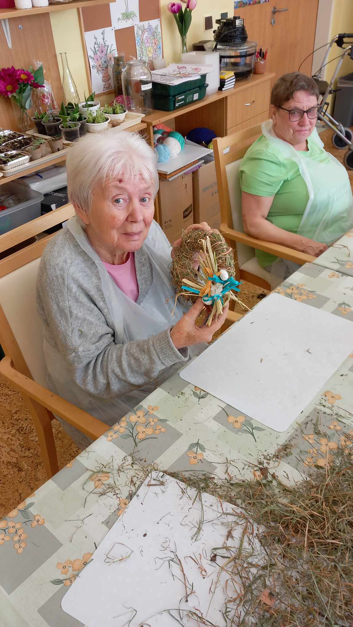 V zahradní terapii jsme zpracovávali seno. Vytvořili jsme si jarní věnečky.