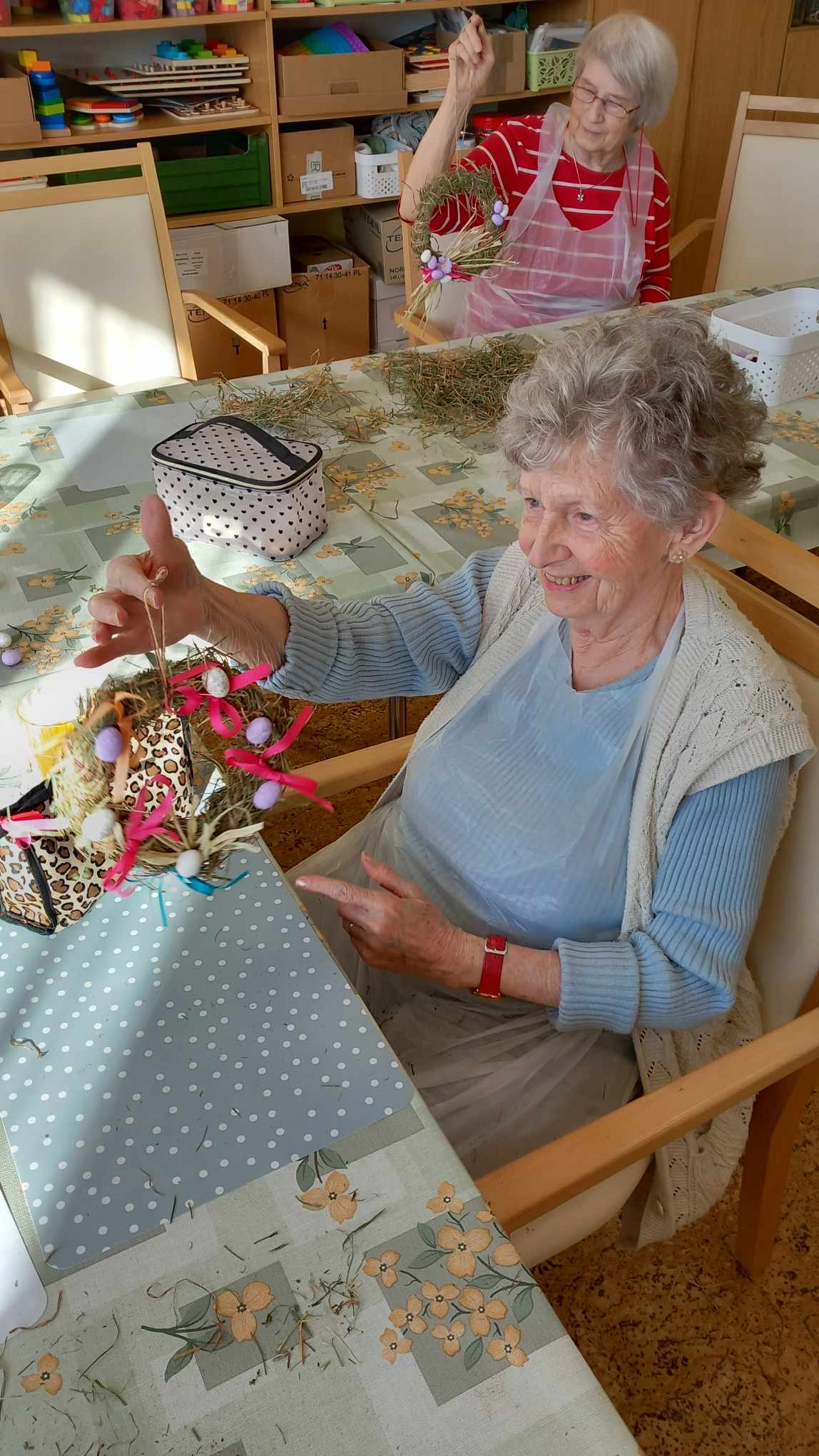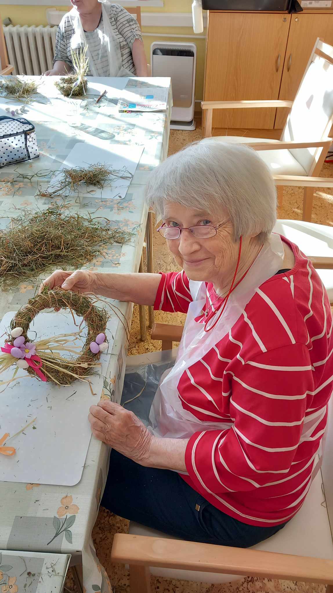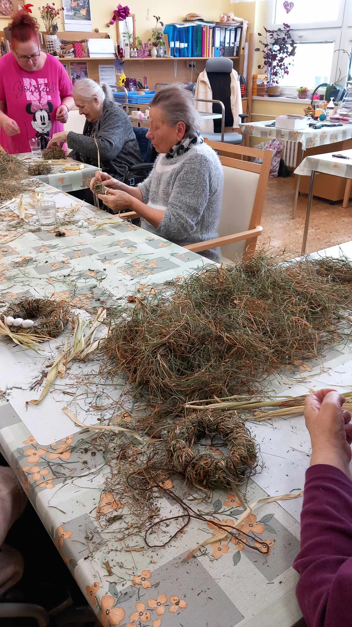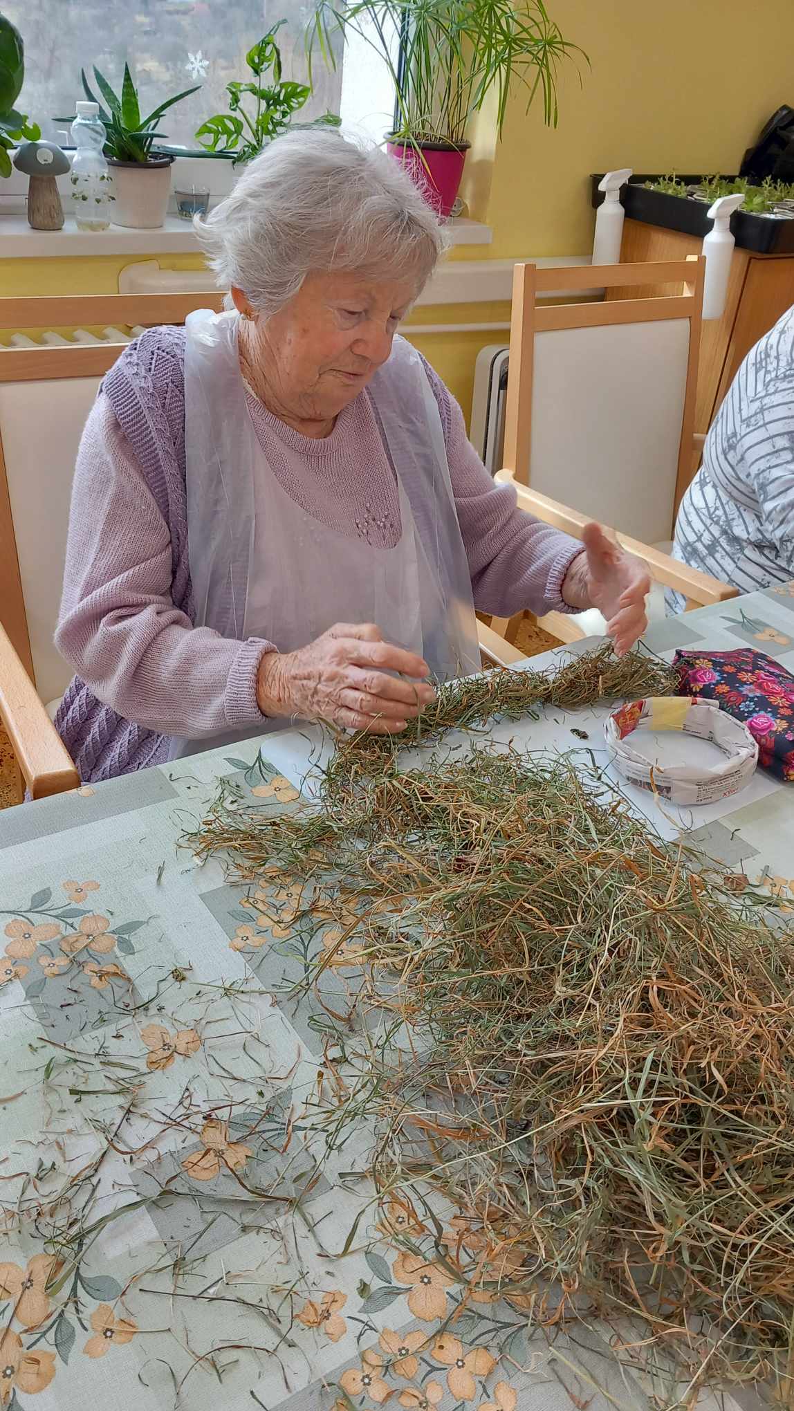 V zahradní terapii jsme zpracovávali seno. Vytvořili jsme si jarní věnečky.
