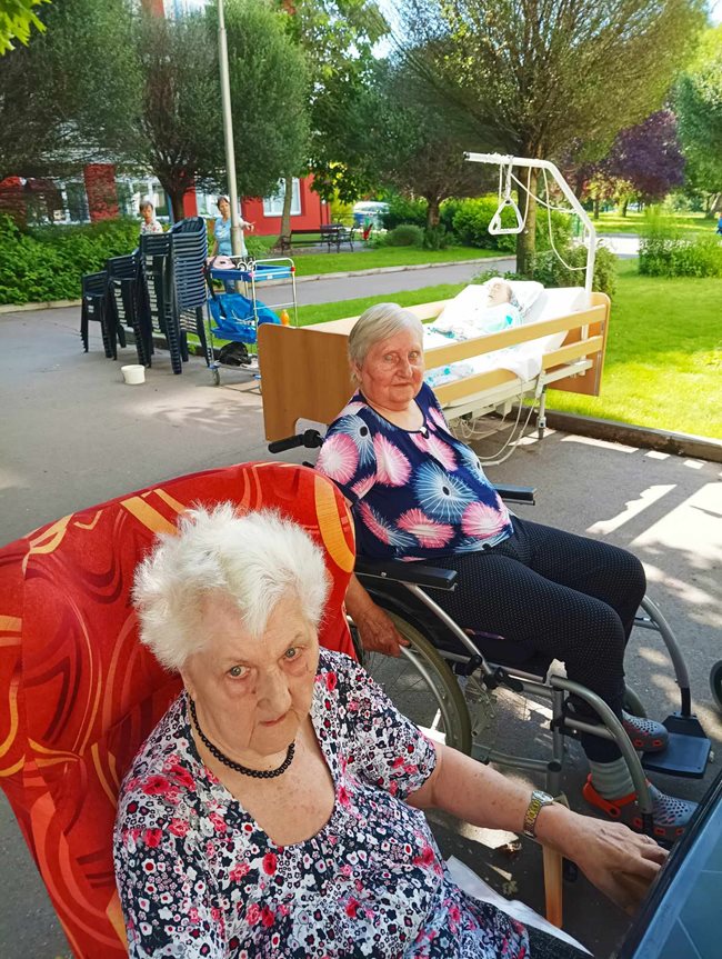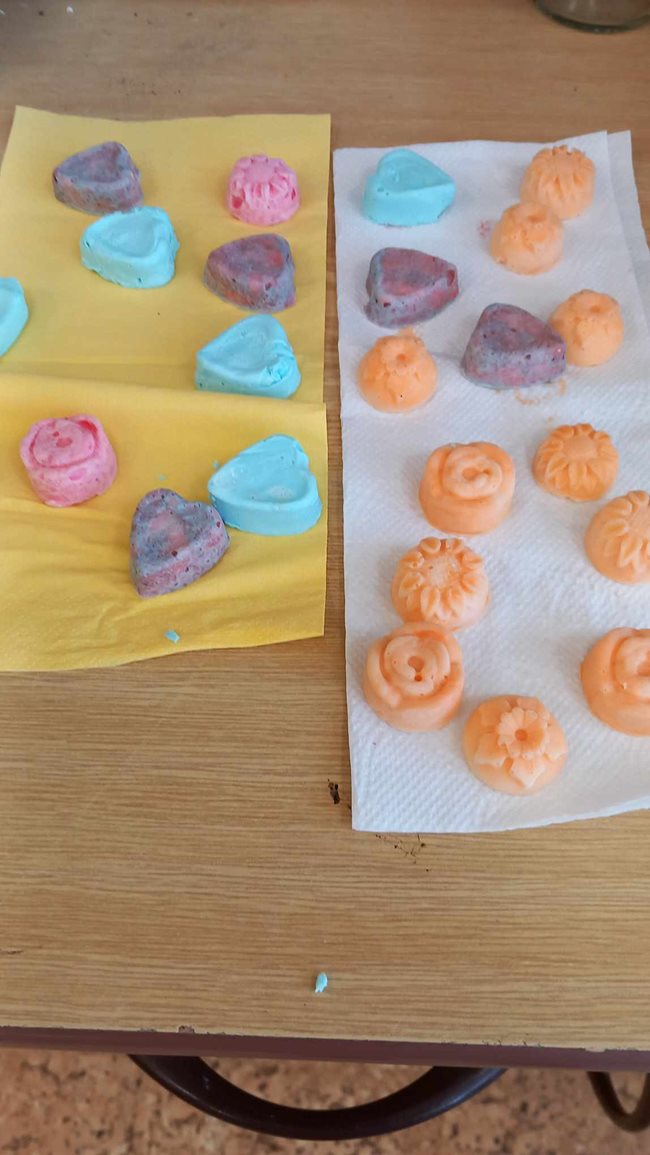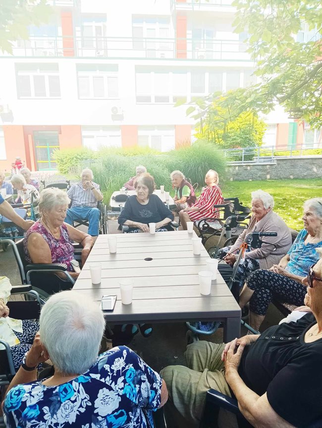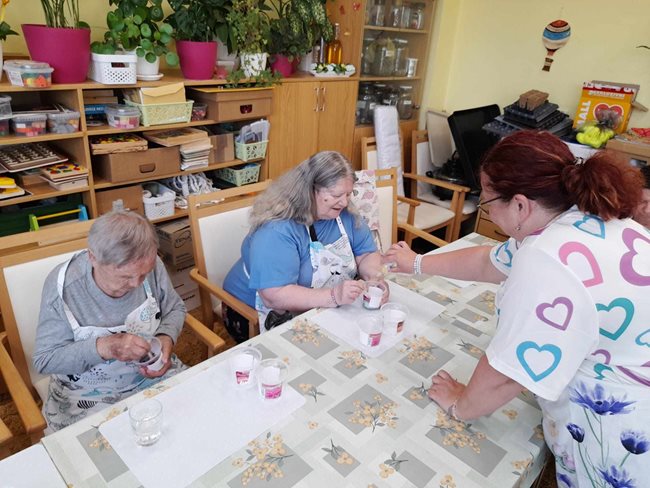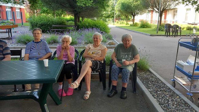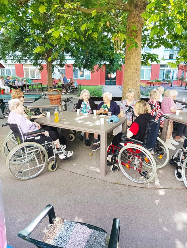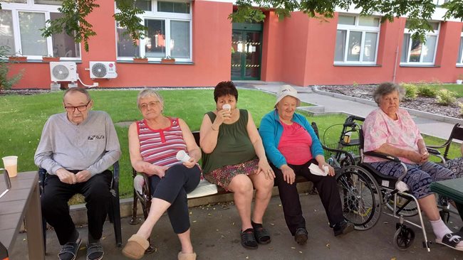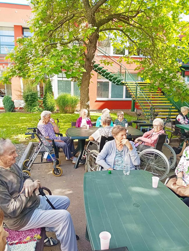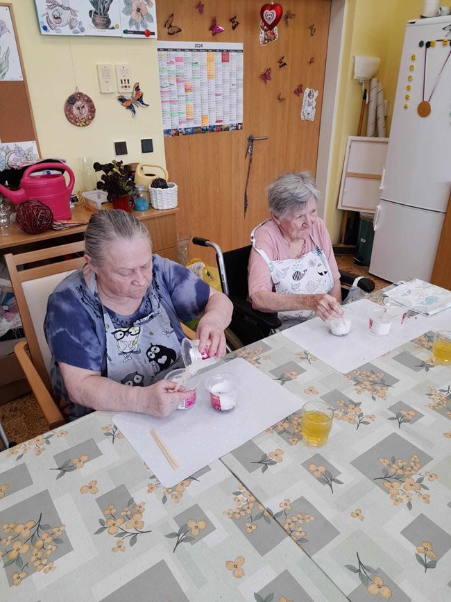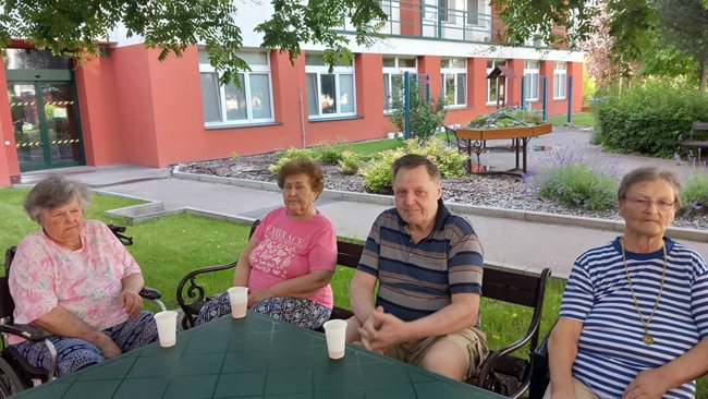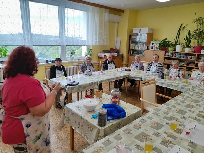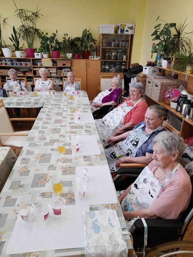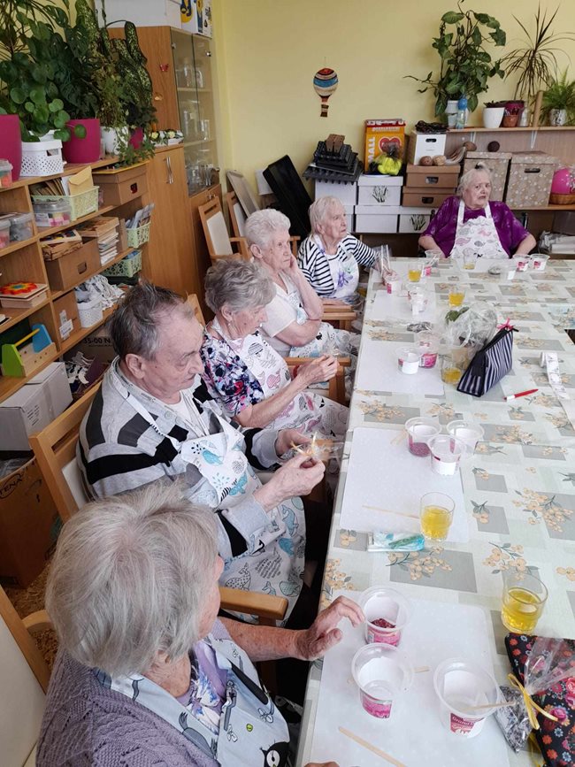 V zahradní terapii jsme vyráběli voňavou sůl do koupele, mýdla a krémy. Pěkné počasí nás láká k posazení v zahradě ve stínu pod platanem.
