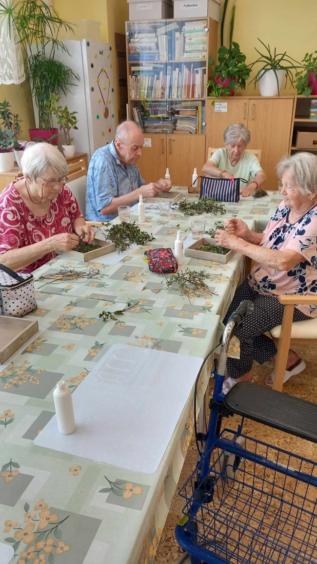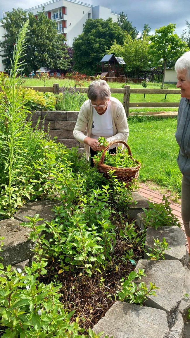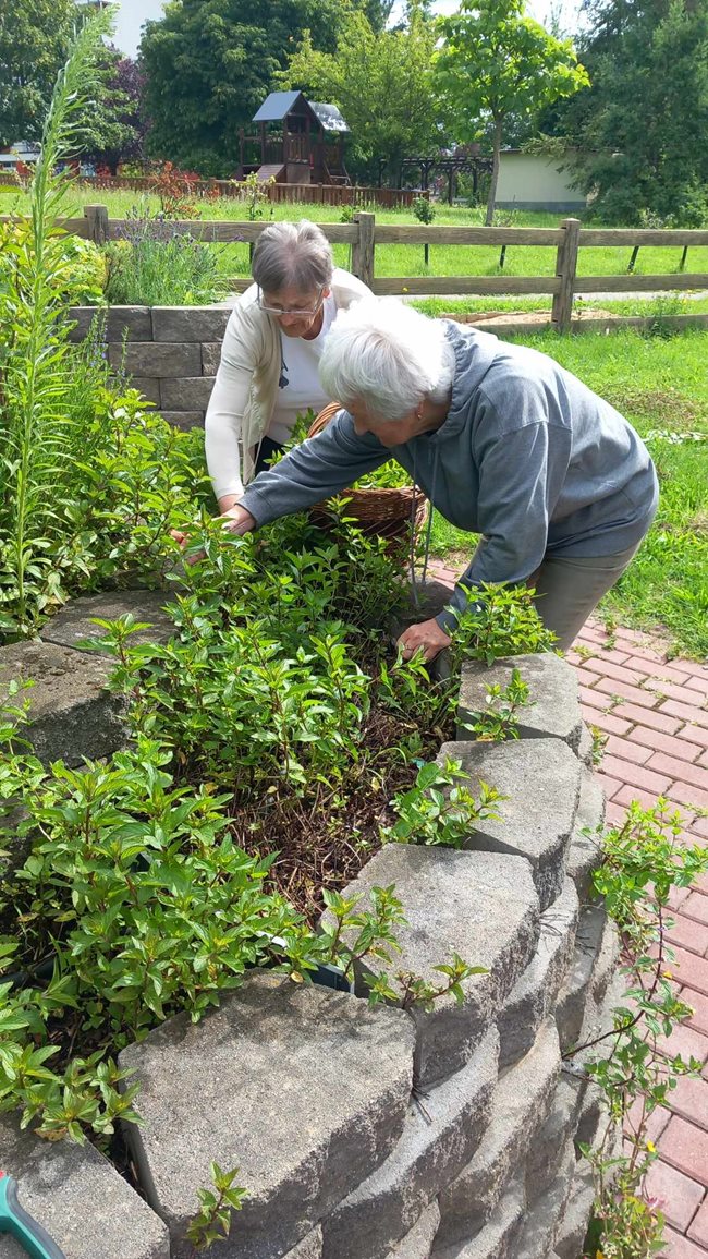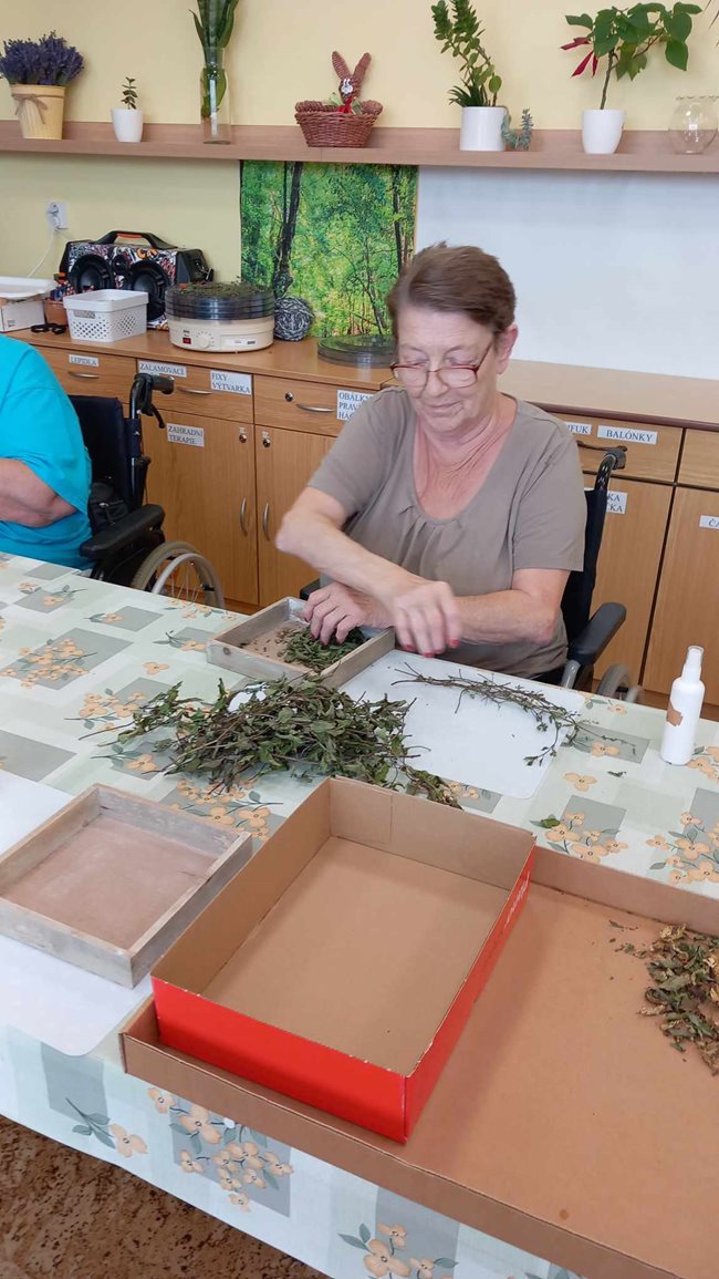 V zahradní terapii jsme sesbírali a dali sušit bylinky, které se nám budou hodit v zimě na léčivé čaje až dorazí rýma. Po práci jsme si zpříjemnili tropické dny relaxací s vonnými oleji a bylinkami v koupeli a masážemi s odpočinkem.