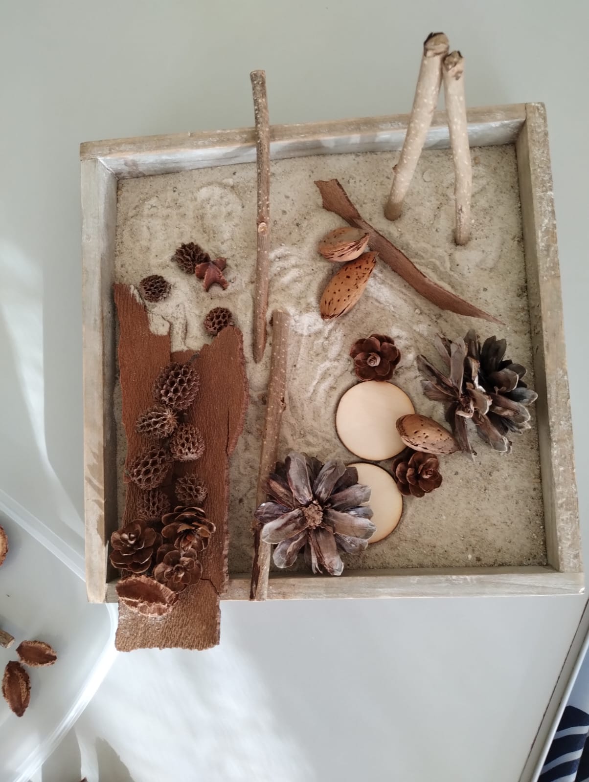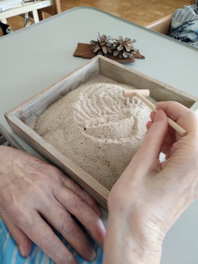 zenové mini zahrádky. Klienti si mohli vytvořit vlastní malou oázu klidu z písku a přírodnin, jako jsou kamínky, šišky či dřívka. Aktivita byla přizpůsobena individuálním možnostem každého z nich, ať už formou manuální činnosti nebo společného povídání o významu zenových zahrad. Tato smyslová a kreativní činnost přinesla našim klientům nejen radost z tvorby, ale také příjemné chvíle uvolnění a pohody.