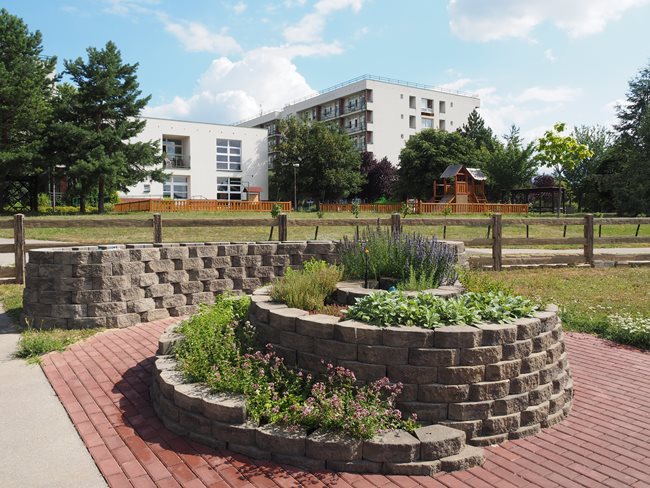 Domov pro seniory je umístěn v rozlehlé zahradě. Součástí zahrady je rybníček s rybkami, posezení pod pergolami, truhlíky pro pěstování bylin, květin a drobných plodů (jahody, rajčata). Posilovací stroje zde slouží k protažení unavených končetin. V zahradě je také umístěno venkovní hřiště pro petanque. Jsou zde pořádány různé kulturní akce, např. tradiční hody, turnaj v petanque, Věstonický sedmiboj, sportovní hry, setkání s různými zvířaty, opékání buřtů...